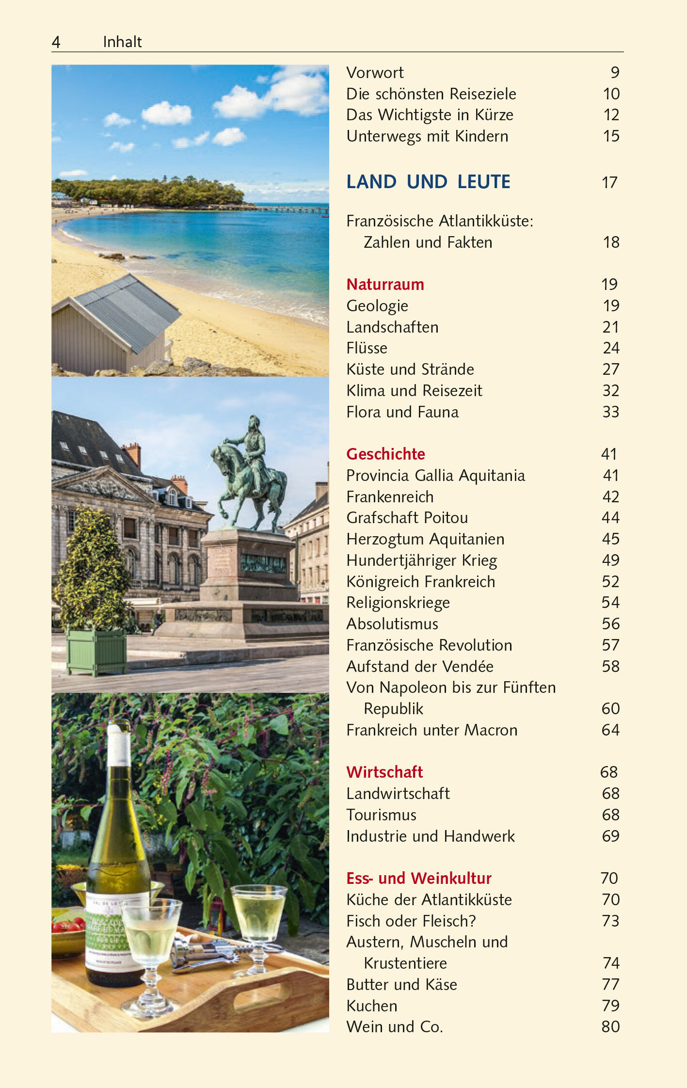 Vorwort 9 Die schönsten Reiseziele 10 Das Wichtigste in Kürze 12 Unterwegs mit Kindern 15 LAND UND LEUTE 17 Französische Atlantikküste: Zahlen und Fakten 18 Naturraum 19 Geologie 19 Landschaften 21 Flüsse 24 Küste und Strände 27 Klima und Reisezeit 32 Flora und Fauna 33 …