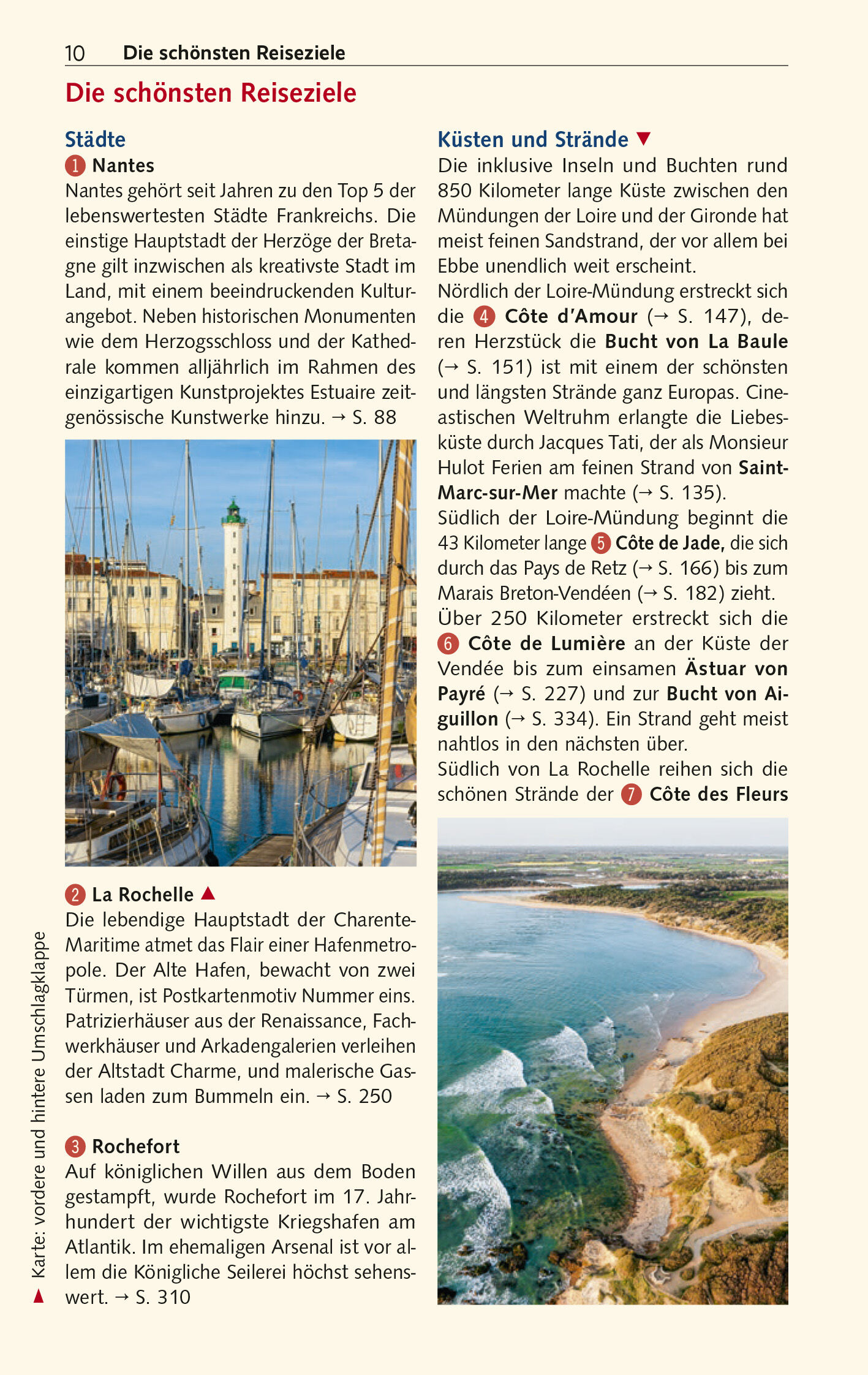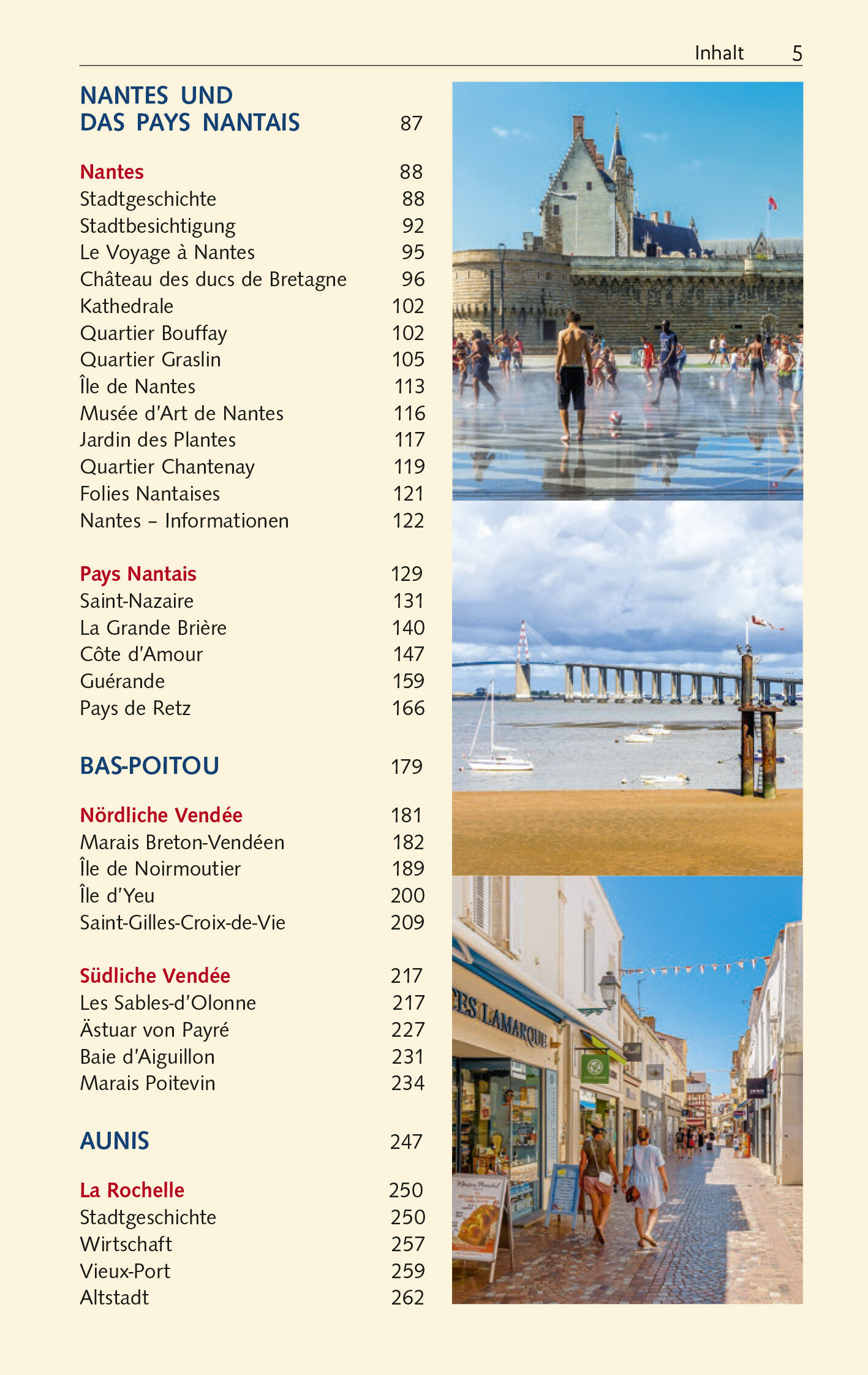 Von der Côte d'Amour, wo schon Monsieur Hulot Ferien machte, bis südlich zur Côte de Beauté reihen sich am Atlantik traumhafte Strände aneinander. Baden, Surfen und Kiten sowie Bummeln in kleinen Häfen und Fischerdörfern zählen zu den Top-Freizeitaktivitäten. Viele Seebäder haben noch ihren charmanten Belle-Époque-Charakter bewahrt. Nantes im Mündungsgebiet der Loire, einst Hauptstadt der Bretagne-Herzöge, hat sich zu einer quirligen Kunst- und Kulturmetropole entwickelt. Im Vieux Port, dem historischen Seehafen von La Rochelle, verschmelzen Geschichte und Ozean.