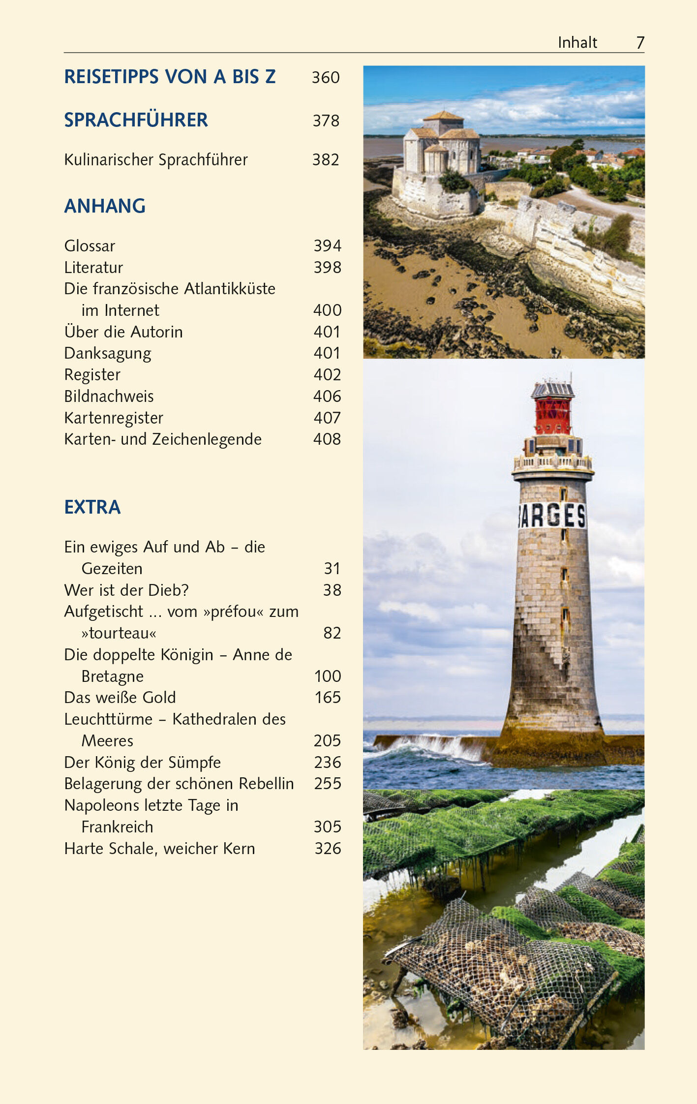 Seite 88 IM LABYRINTH DER STILLEN WASSER La Grande Brière > Seite 140 WO MONSIEUR HULOT FERIEN MACHTE Côte d'Amour > Seite 147 WEIßES GOLD Die Salzgärten von Guérande > Seite 162 KÖNIGREICH DER FEINEN KARTOFFELN Île de Noirmoutier > Seite 189 DIE SCHÖNE REBELLIN La Rochelle > Seite 250 WO DIE ZEIT STEHEN GEBLIEBEN IST Île d'Aix > Seite 302 SEILE UND SEGELSCHIFFE FÜR DEN SONNENKÖNIG Rochefort > Seite 310 HARTE SCHALE, WEICHER KERN Austern > Seite 326 INSELIDYLL IM ATLANTIK Île d'Oléron > Seite 333 Zwischen den Mündungen der Loire und der Gironde in den Atlantik erstreckt sich eine 800 Kilometer lange Küste mit Traumstränden für Familien, Wassersportler und Sonnenhungrige. Ihren ganz eigenen Reiz haben die Inseln und lebendigen Hafenstädte, aber auch die Sumpfgebiete im Hinterland lohnen einen Abstecher. In aus-gedehnten Salzgärten wird seit Jahrhunderten das edle Fleur de Sel gewonnen, und von der ebenso traditions-reichen Austernzucht profitieren auch die Urlauber. Dieser Reiseführer bietet eine umfangreiche Einführung zu Natur, Geschichte und Kulinarik. Zahlreiche Essays beleuchten die Hintergründe, detailliert beschrieben werden Städte, Inseln und Sehenswürdigkeiten. Tipps zu Stränden, Übernachtung, Gastronomie und Aktivitäten sowie detailreiche Karten helfen Individualreisenden bei der Planung und geben Orientierung vor Ort. >>> Weitere Reisführer zu interessanten Regionen in Frankreich finden Sie auf der Website des Trescher Verlags.
