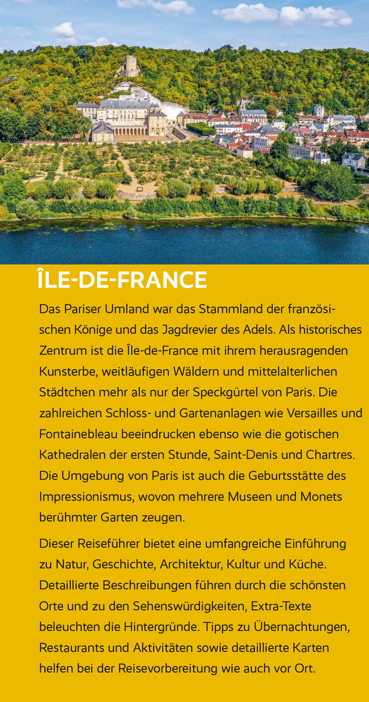 Mit ihrer Fülle an Sehenswürdigkeiten ist die Region rund um Paris weit mehr als nur der Speckgürtel der französischen Hauptstadt. Die imposante Kathedrale von Saint-Denis, Wiege der Gotik, Versailles, das berühmte Schloss Ludwigs XIV., und Fontainebleau, wo vom Mittelalter an alle französischen Herrscherdynastien residierten, sind UNESCO-Welterbestätten. Das kaum weniger majestätische Schloss Rambouillet diente bis 2009 als Sommerresidenz der französischen Staatspräsidenten. Wie Fontainebleau ist es von ausgedehntem Wald umgeben beliebte Ausflugsziele der "Francilien", der Einwohner der Île-de-France.