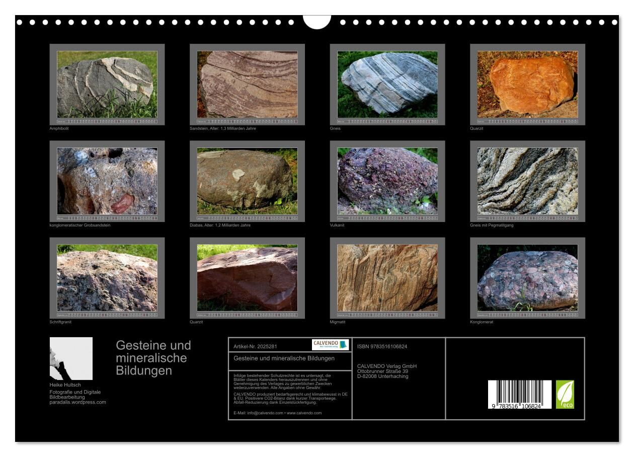 Lassen Sie sich verzaubern von der Vielfalt der Gesteine und Mineralien. Ein Kalender nicht nur für Mineralienfreunde und -sammler, Geologen und Künstler. Die hochwertigen Aufnahmen zeigen die Schönheit und Details der teils bereits Milliarden alten Gesteine.
