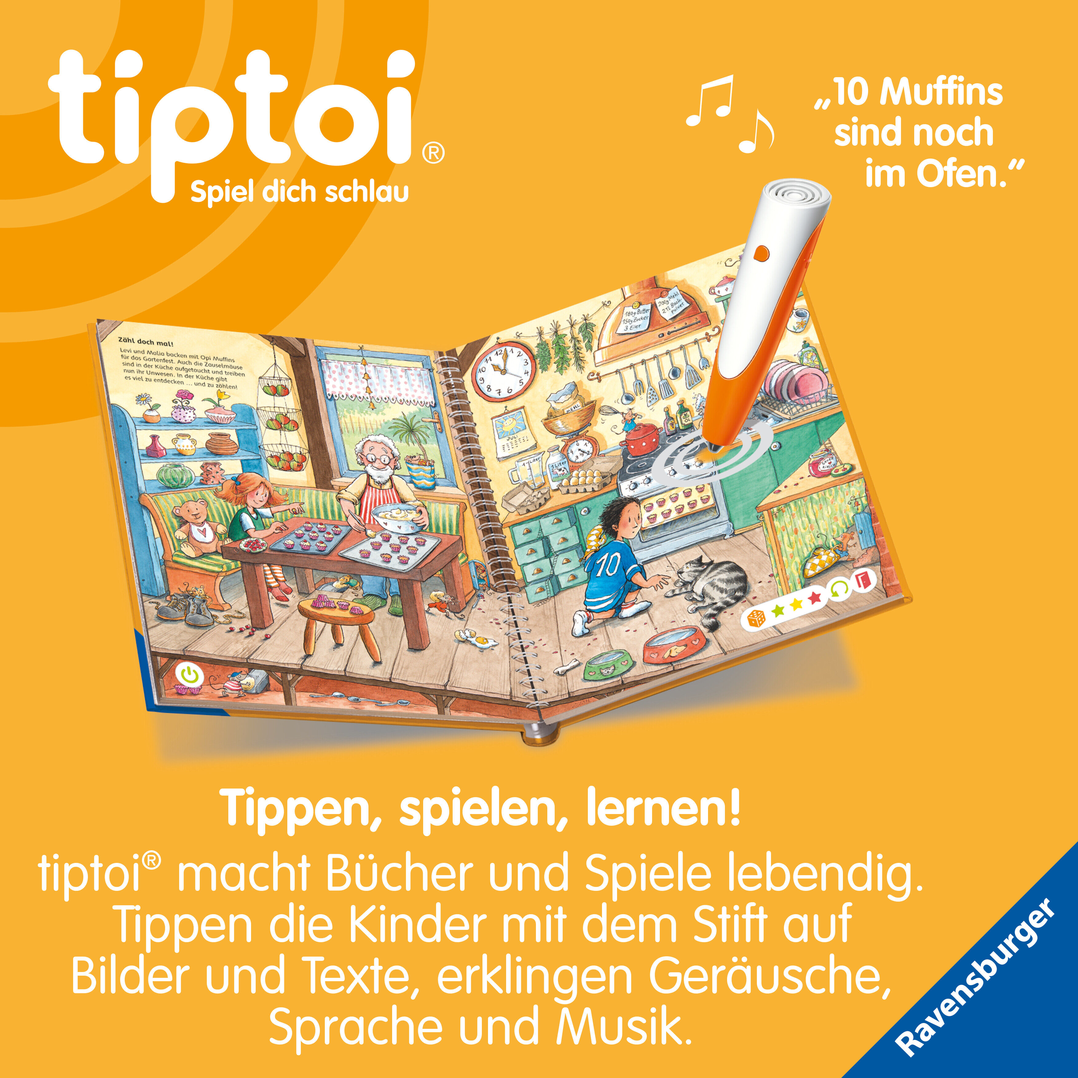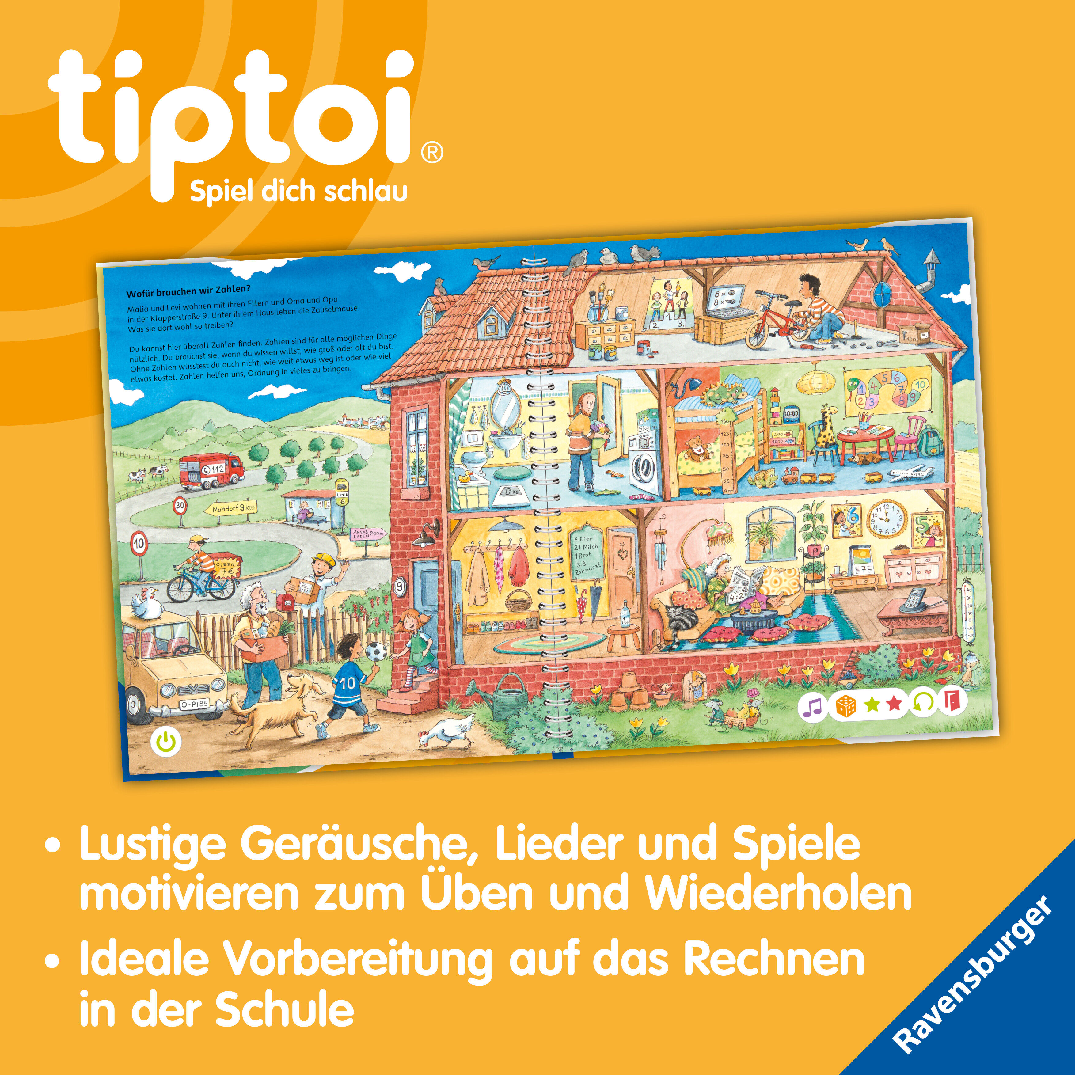 2,3,4 - Welche Zahl passt hier? Mit tiptoi ganz einfach die Zahlen lernen Die Kinder begleiten die Geschwister Malia und Levi beim Backen, beim Einkaufen und auf dem Gartenfest. Sie helfen den beiden Mengen zu vergleichen, mit den passenden Scheinen und Münzen...