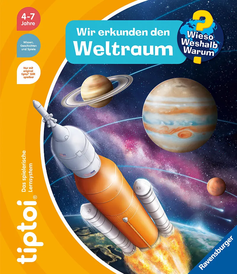 tiptoi® Wieso? Weshalb? Warum? Wir erkunden den Weltraum Für ALL-wissende Kids Wie entsteht ein Stern? Welche Ausrüstung braucht ein Astronaut? Wie schnell können Raketen fliegen? Und können wir auf dem Mond leben? Gemeinsam mit Ellie, Paul und Selma entdecken...