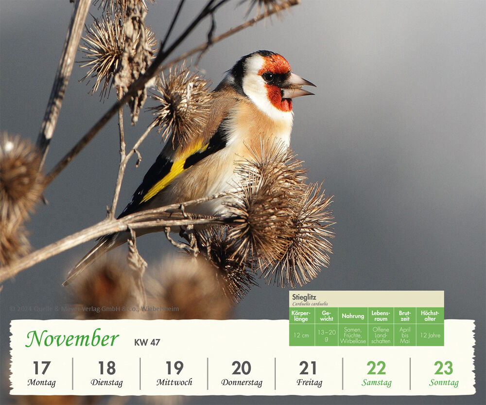 Dieser neue Wandkalender im Format 24 x 20 cm stellt Woche für Woche heimische Vogelarten auf brillanten Fotos vor, ergänzt durch kurze, steckbriefartige Porträts, die alles Wissenswerte zu der jeweiligen Art beinhalten. Ein jederzeit willkommenes Geschenk für...