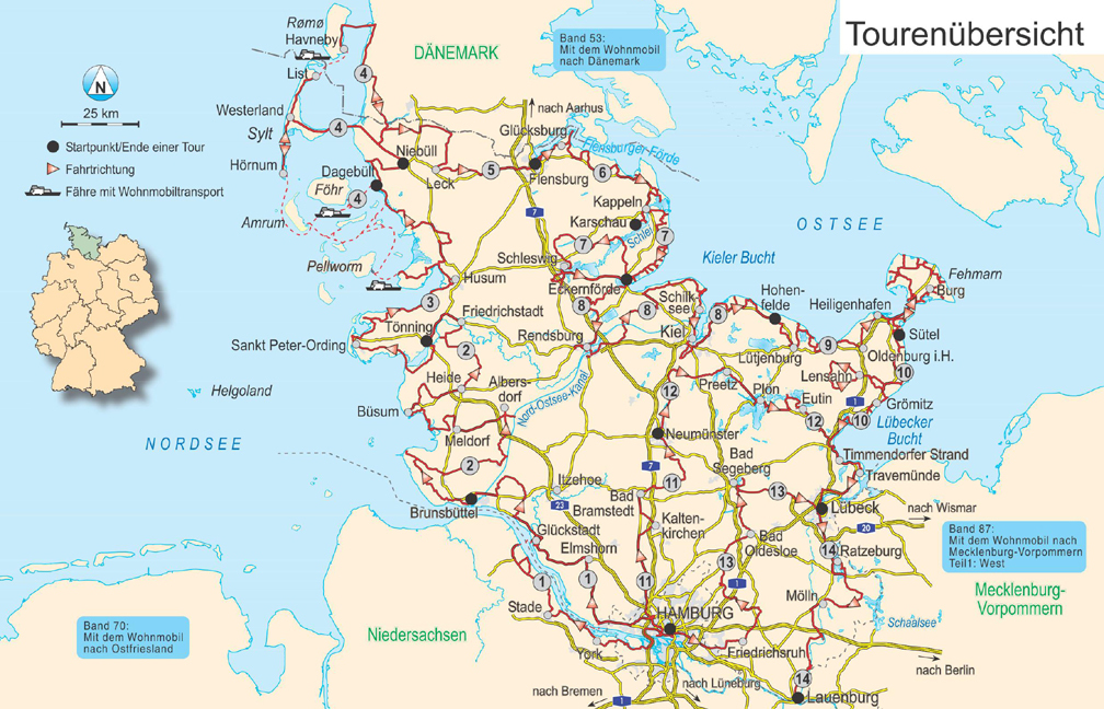 Tourenkarten Präzise Karten führen zu allen im Buch beschriebenen Zielen. Stadtpläne und Detailkarten vervollständigen die Orientierung. Die 14 sorgfältig recherchierten Touren führen über mehr als 2500 Kilometer durch Schleswig-Holstein und Hamburg. Natur erl...Tourenkarten Präzise Karten führen zu allen im Buch beschriebenen Zielen. Stadtpläne und Detailkarten vervollständigen die Orientierung. Die 14 sorgfältig recherchierten Touren führen über mehr als 2500 Kilometer durch Schleswig-Holstein und Hamburg. Natur erleben, wandern, Rad fahren Flüsse, Seen, Dünen, Wandertouren, Aussichtspunkte. Die großen und die weniger großen Natursehenswürdigkeiten für konditionsstarke Wanderer, Radler, Mountainbiker und Spaziergänger. Kulturschätze, Städte Romantische Altstädte, Festungen, Burgen, Schlösser, Kirchen, Museen. Die bedeutensden Bauwerke in Schleswig-Holstein und Hamburg im historischen Zusammenhang für geschichtsinteressierte und kulturbeflissene Reisende. Wasser erleben, baden Strände, Badeseen, Freibäder, Thermen, Flüsse. Für Badegäste, Wellnessliebhaber, Erholungssuchende, Kitesurfer, Wassersportler und Angler. Die Auswahl ist groß und vielfältig, da ist für jeden etwas dabei. WOMO-Service 230 Stell- und Übernachtungsplätze mit ausführlichen Beschreibungen, Adressen und GPS-Koordinaten. Viele weitere Adressen und GPS-Koordinaten die zu den Parkplätzen ausgesuchter Reiseziele führen, auf denen eine Übernachtung nicht möglich ist.