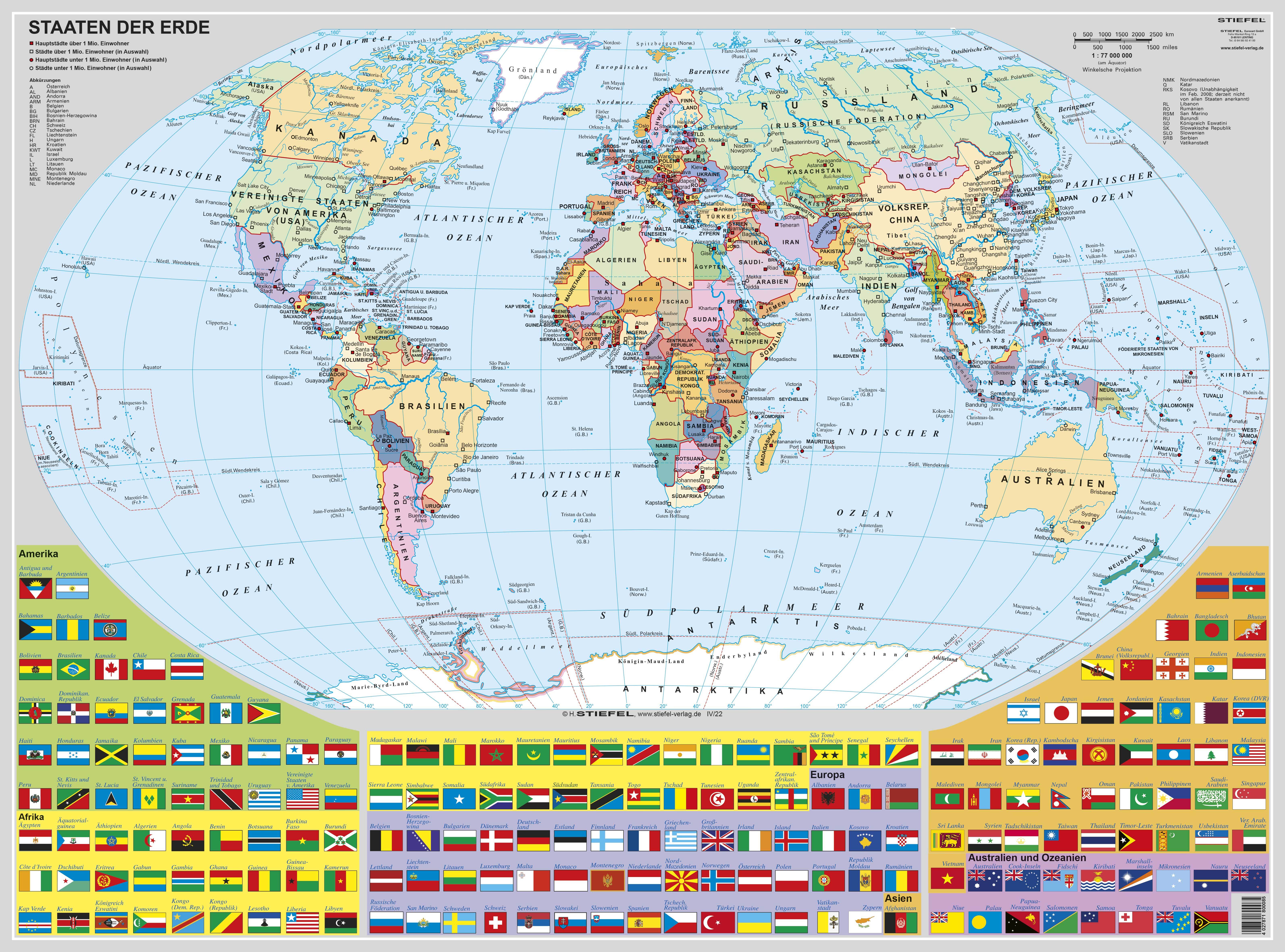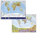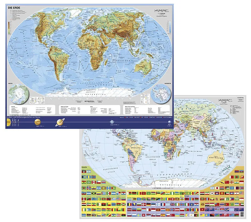 beidseitig bedruckte Schreibunterlage mit Softtouch-Folie veredelt - rutschfest - beschreib- und abwischbar - für Schulbänke passendes Format BxH 54 x 40 cm - physische Darstellung der Erde mit Gebirgsrelief - Ländergrenzen, Hauptstädte und große Städte - Höhe...