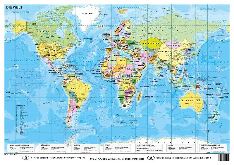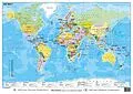 Wandkarte / Poster - politische Weltkarte mit hohem Informationsgehalt - Namen und Staatsgrenzen aller Staaten der Erde - Hauptstädte und wichtige Städte ab 500.000 Einwohnern - Angabe der Namen von Ozeanen und Meeren mit Meerestiefen sowie warmer und kalter M...