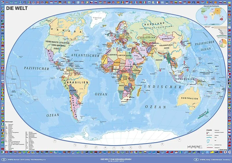 Umweltfreundliches Lernposter in DIN A1 für das Kinderzimmer gedruckt auf hochwertigem Papier aus nachhaltiger Forstwirtschaft Druckfarben und Schutzlack erfüllen die Norm für Kinderspielzeug EN71/3 - einfache politische Darstellung der Erde - mit Flaggenrand ...