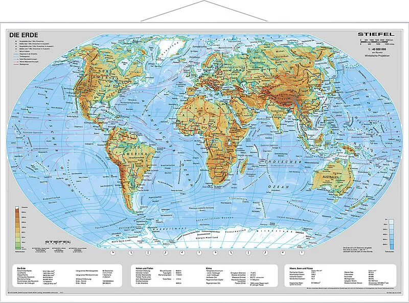 Wandkarte mit Metallbeleistung - beschreib- und abwischbar - extrem reißfest - physische Darstellung der Erde in Winklischer Projektion - Ländergrenzen, große Städte und Hauptstädte - Meerestiefen mit warmen und kalten Meeresströmungen - Landschaftsbezeichnung...