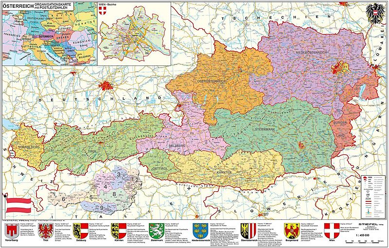 Wandkarte mit Metallbeleistung - beschreib- und abwischbar - extrem reißfest - Inselkarte Österreich politisch mit PLZ für jeden angegebenen Ort - Bundeslandgrenzen und Verwaltungsgliederungen bis Bezirksebene - Landes- und Bezirkshauptstädte gekennzeichnet - ...