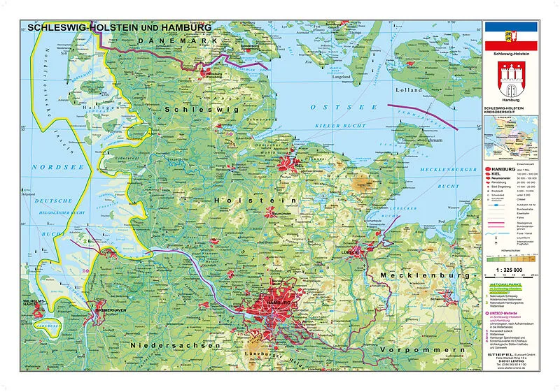 Papierposter - Schleswig-Holstein und Hamburg - physische Darstellung Schleswig-Holsteins - Staatsgrenze und Bundeslandgrenze - Nationalparks und UNESCO-Welterbestätten - Ortsangaben auch unter 10.000 Einwohner (in Auswahl) - Autobahnen, Bundesstraßen und inte...