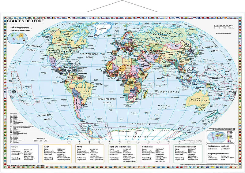 Wandkarte mit Metallbeleistung - beschreib- und abwischbar - extrem reißfest - Flaggen aller Staaten - Hauptstädte der Länder - politische Weltkarte mit den Ländergrenzen - Basiswissen je Kontinent z.B. größte Stadt, längster Fluss, höchster Berg, Fläche und E...