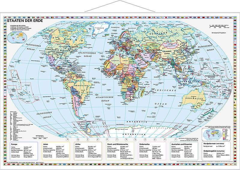 Wandkarte mit Metallbeleistung - beschreib- und abwischbar - extrem reißfest - Flaggen aller Staaten - Hauptstädte der Länder - politische Weltkarte mit den Ländergrenzen - Basiswissen je Kontinent z.B. größte Stadt, längster Fluss, höchster Berg, Fläche und E...