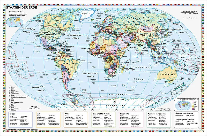 Wandkarte / Poster - beschreib- und abwischbar - extrem reißfest - Flaggen aller Staaten - Hauptstädte der Länder - politische Weltkarte mit den Ländergrenzen - Basiswissen je Kontinent z.B. größte Stadt, längster Fluss, höchster Berg, Fläche und Einwohnerzahl...