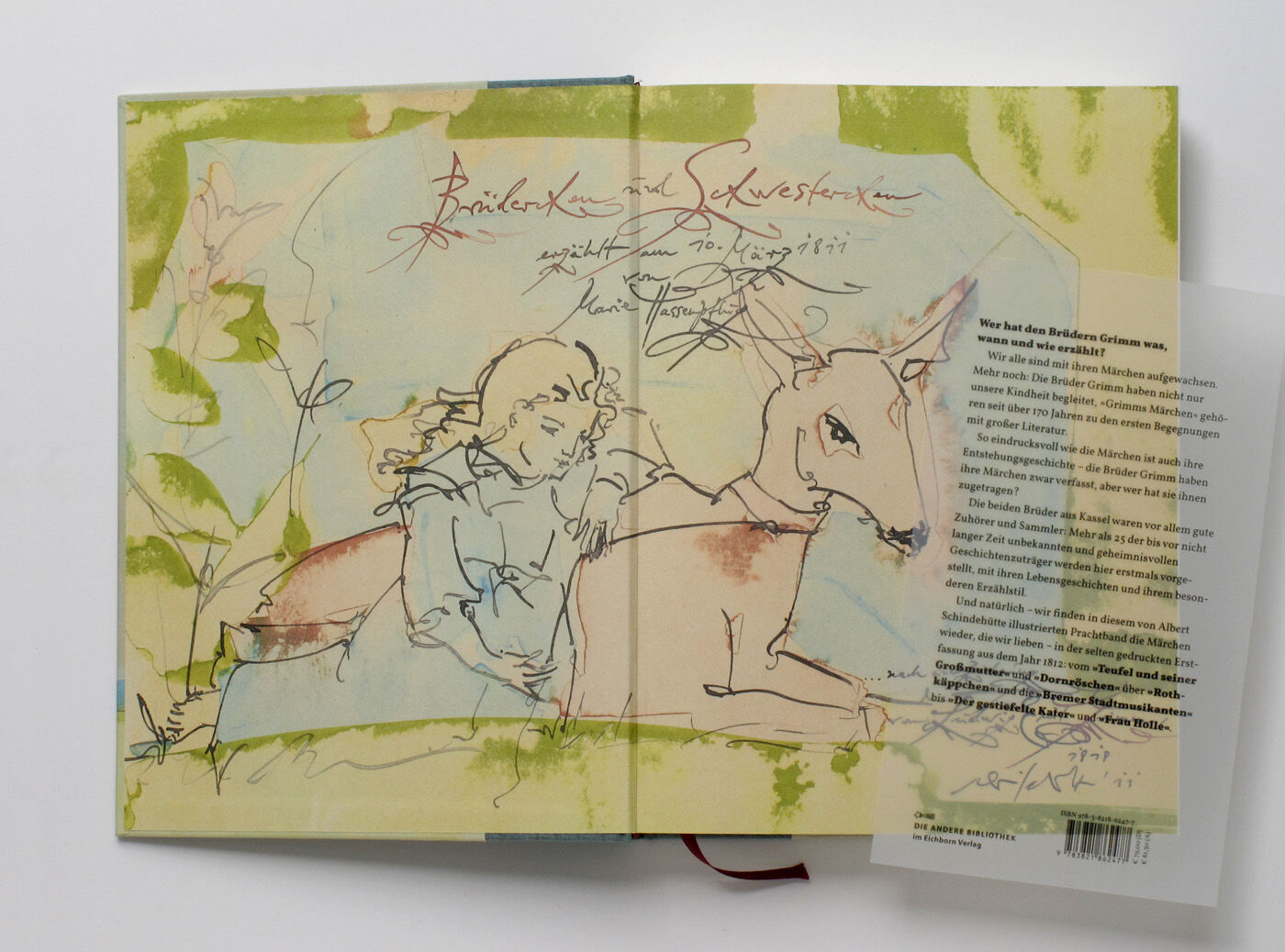 Albert Schindehütte, ebenfalls ein großer Kenner des Grimm'schen Werkes und seit 1997 als ihr Gründer in der Schauenburger Märchenwache für sie tätig, umkleidet die Märchen mit seinen prächtigen und farbigen Kalligraphien.