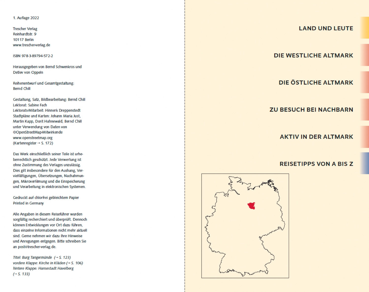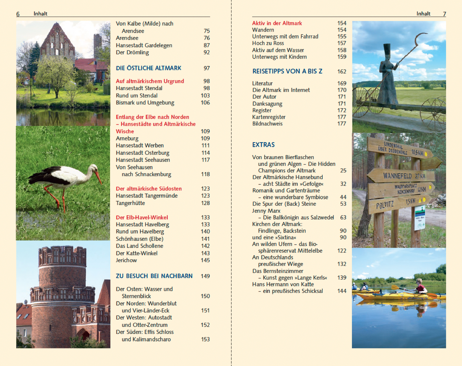 FACHWERK, BACKSTEINGOTIK UND SCHÖNE FRAUEN Hansestadt Salzwedel » Seite 57 KLEINODIEN VON WELTRANG Die Kirchen in Osterwohle und Berge » Seite 65, 86 SEGEL, STEAMBOAT, STRANDBAD Arendsee die Perle der Altmark » Seite 78 WO EIN BERLINER IDOL GEBOREN WURDE Hansestadt Gardelegen » Seite 83 DAS LAND DER TAUSEND GRÄBEN Der Drömling » Seite 92 DIE STADT DER SCHÖNEN TORE Hansestadt Stendal » Seite 98 KAISERSTADT AN DER ELBE Hansestadt Tangermünde » Seite 123 DEICHGRAF UND REICHSKANZLER In der Heimat Otto von Bismarcks » Seite 132 DER DEAL MIT DEM BERNSTEINZIMMER Havelberg und der Elb-Havel-Winkel » Seite 133 Die weite Landschaft der Altmark ist ein Paradies für Radler und Reiter, Wanderer und Skipper. Hier kann man in die Stille einzigartiger Natur eintauchen. Dazu kommen historische Hansestädte wie Tangermünde, Stendal, Gardelegen und Salzwedel, geprägt von norddeutscher Backsteingotik sowie romanischen Kirchen und Klöstern. Gemächlich mäandern Havel und Elbe durch das UNESCO-Biosphärenreservat; am Arendsee, in der weiten Mildeniederung und im Elb-Havel-Winkel erlebt man im Frühjahr und Herbst das grandiose Schauspiel des Vogelzugs durch Europa. Dieser Reiseführer stellt die Wiege Preußensumfassend vor und bietet viel Wissenswertes zur reichen Geschichte und Kultur der Region. Er enthält außerdem ausführliche aktuelle Reiseinformationen, persönliche Tipps, Hinweise für Aktivtouristen und Familien sowie Abstecher in die niedersächsischen und brandenburgischen Nachbarregionen. » Weitere Reiseführer zu interessanten Zielen in Deutschland finden Sie auf der Website des Trescher Verlags