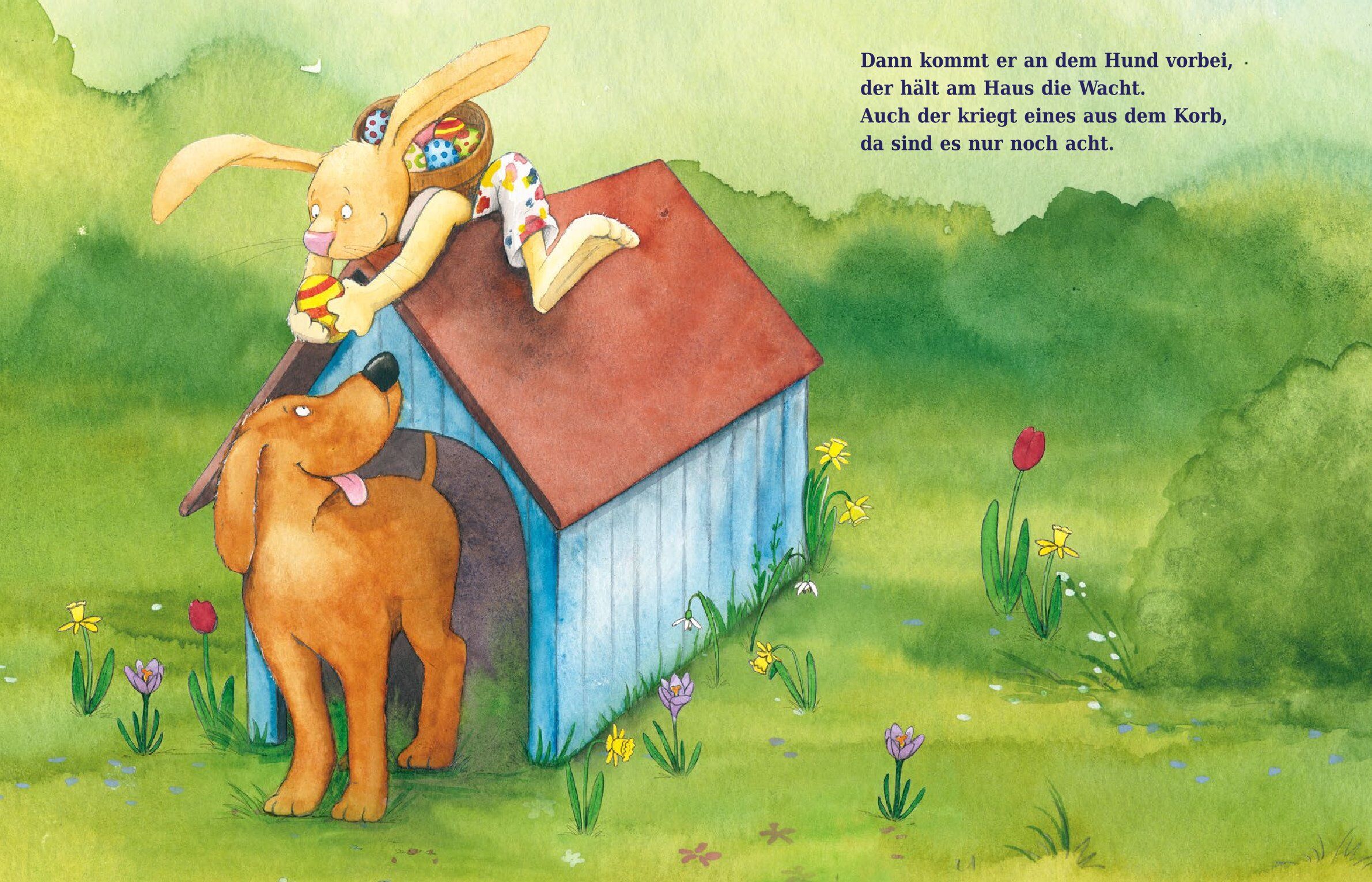 Da drüben sitzt ein Osterhas' von Helga Fell und Antje Bohnstedt ist eine rasante Reimgeschichte um den schenkfreudigen Osterhasen, die Kinder zum Entdecken und Mitsprechen einlädt und so nebenbei mit den Zahlen bis 10 vertraut macht. Wer bekommt die Ostereier...