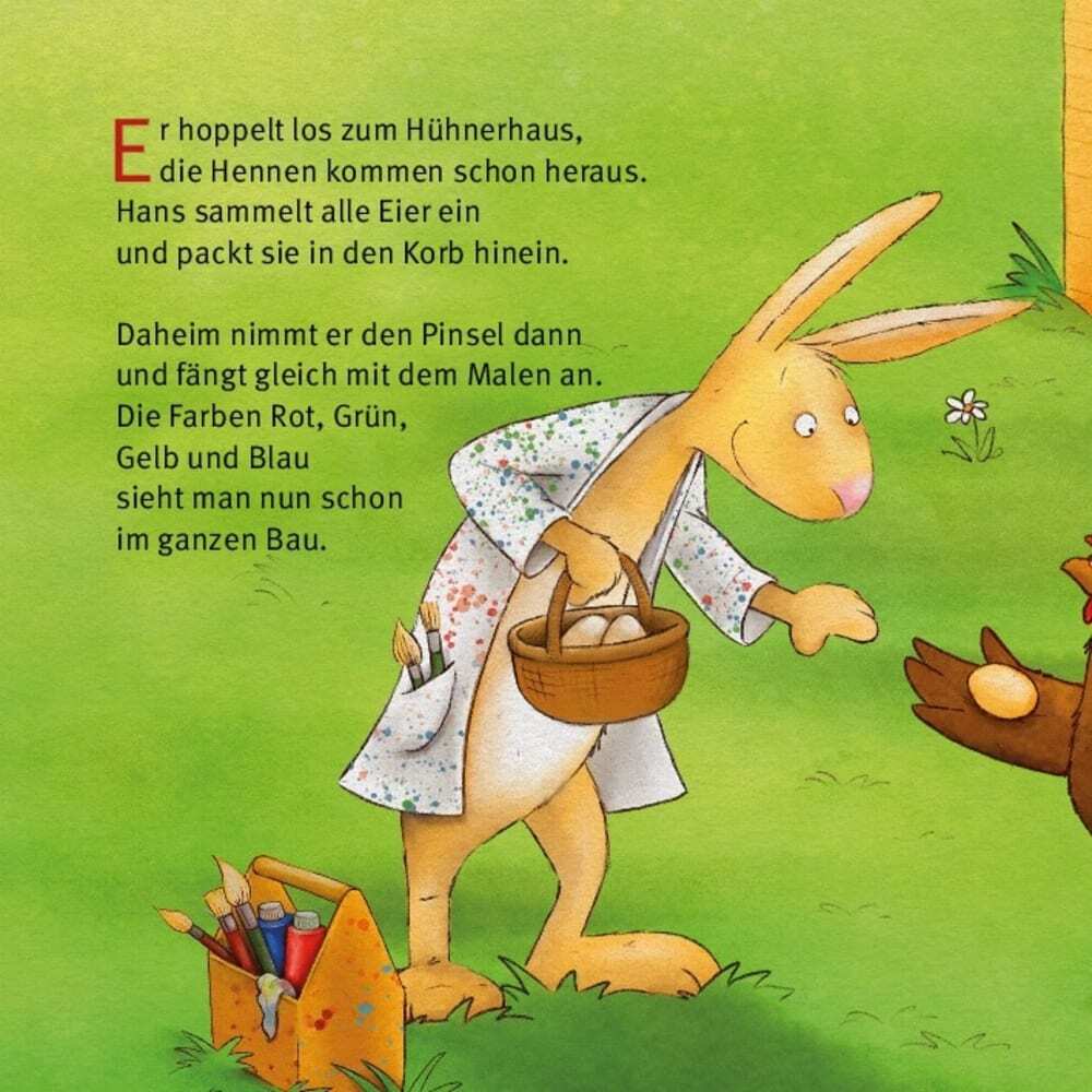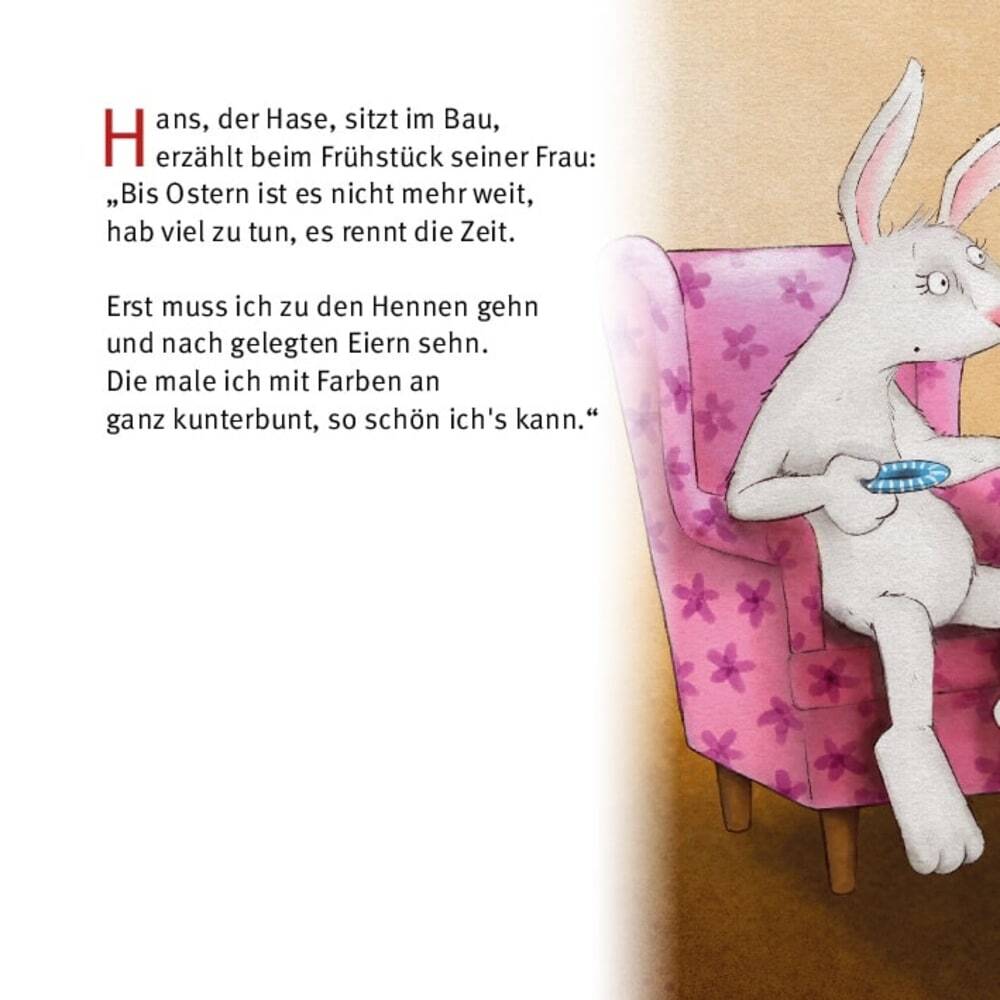 Wie soll Osterhase Hans es nur rechtzeitig schaffen, alle Eier bunt zu bemalen? Seine Frau hat eine geniale Idee. Hosentaschenfreundliches Mini-Bilderbuch. Wie werden die Ostereier bunt? Witzige Ostergeschichte fürs Osternest Bald ist Ostern! Doch Osterhase Ha...