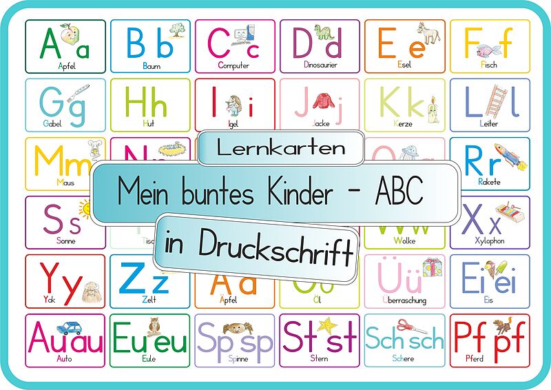 Lern karten Mein buntes Kinder ABC ohne Artikel DINA4 in Druckschrift ohne Artikel, mit Doppellauten, Umlauten und Sp, St, Sch und Pf. Mein buntes Kinder ABC ohne Artikel DINA4 in Groß- und Kleinbuchstaben Unsere neuen Lernkarten Mein buntes Kinder ABC ohne Ar...