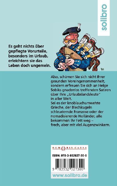 Es geht nichts über gepflegte Vorurteile, besonders im Urlaub, erleichtern sie das Leben doch ungemein. Also, schämen Sie sich nicht Ihrer gesunden Voreingenommenheit Helge Sobik tut es auch nicht , sondern erfreuen Sie sich an seinen gnadenlos treffenden Sati...Es geht nichts über gepflegte Vorurteile, besonders im Urlaub, erleichtern sie das Leben doch ungemein. Also, schämen Sie sich nicht Ihrer gesunden Voreingenommenheit Helge Sobik tut es auch nicht , sondern erfreuen Sie sich an seinen gnadenlos treffenden Satiren über Ihre "Urlaubslandsleute" in aller Welt. Der weitgereiste Journalist und Reiseschriftsteller Helge Sobik zeichnet mit prägnantem "Strich" die nationalen Eigenheiten der bekanntesten "Urlaubslandsleute". Sei es des knoblauchumwehten Griechen, des Blechkugeln schleudernden Franzosen oder des nomadisierenden Holländers. Alle bekommen Ihr Fett weg frech, aber mit viel Augenzwinkern. "Zwei Dinge haben Helge Sobik schließlich vor Vergeltungsmaßnahmen aus dem Ausland bewahrt: Dass er zu guter Letzt auch den Deutschen durch den Wolf drehte und dass zwischen all den unfairen Unterstellungen stets ein liebevolles Lächeln und Augenzwinkern hervorblitzte. Das jetzt erschienene Buch (.) ist ein Lektüretipp für alle, die Sinn für schrägen Humor haben." (Sonntag aktuell) ". führt die gängigen Verallgemeinerungen ad absurdum. (.) Sobiks freche, kleine Impressionen aus aller Welt zeigen, daß viele Klischees zwar stimmen, aber man dennoch immer neugierig bleiben sollte um in jedem Land, und in jedem Volk das ganz Eigene und Originelle zu entdecken." (NDR 1, Bücherwelt)