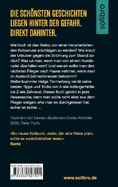 Die schönsten Geschichten liegen hinter der Gefahr. Direkt dahinter. Wie hoch ist das Risiko, von einer herunterfallenden Kokosnuss erschlagen zu werden? Wie krault der Urlauber gegen die Strömung zum Strand zurück? Was tut man, wenn man von einem Hunderudel ü...Die schönsten Geschichten liegen hinter der Gefahr. Direkt dahinter. Wie hoch ist das Risiko, von einer herunterfallenden Kokosnuss erschlagen zu werden? Wie krault der Urlauber gegen die Strömung zum Strand zurück? Was tut man, wenn man von einem Hunderudel überfallen wird? Und warum sollte man den nächsten Flieger nach Hause nehmen, wenn man im Ausland Zahnschmerzen bekommt? Weltenbummler Helge Timmerberg verrät seine besten Tipps und Tricks von A wie Anfängerfehler bis Z wie Zahnarzt. Dieses Buch gehört in jede Reisetasche, denn man sollte nicht eher aus dem Flieger steigen, ehe man es durchgelesen hat, sicher ist sicher. Illustriert vom besten deutschen Comic-Künstler 2002, Peter Puck.