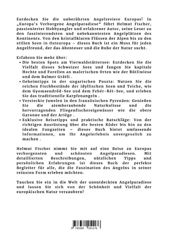 Entdecken Sie die unberührten Angelreviere Europas! In Europa's Verborgene Angelparadiese führt Helmut Fischer, passionierter Hobbyangler und erfahrener Autor, seine Leser zu den faszinierendsten und unbekanntesten Angelplätzen des Kontinents. Von den kristall...