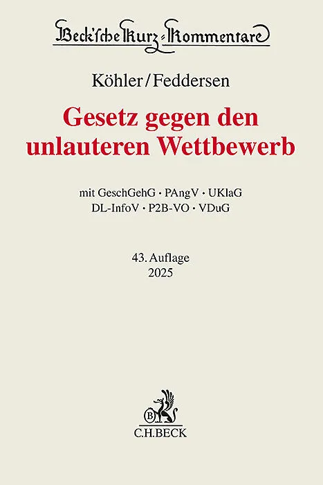 Der Köhler/Feddersen gilt als unverzichtbares Standardwerk. Er kommentiert das UWG, Geschäftsgeheimnisgesetz (GeschGehG), die Preisangabenverordnung (PAngV), das Gesetz über Unterlassungsklagen bei Verbraucherrechts- und anderen Verstößen (UKlaG), die Dienstleistungs-Informationspflichten-Verordnung (DL-InfoV) sowie die Verordnung (EU) 2019/1150 zur Förderung von Fairness und Transparenz für gewerbliche Nutzer von Online-Vermittlungsdiensten (P2B-VO).