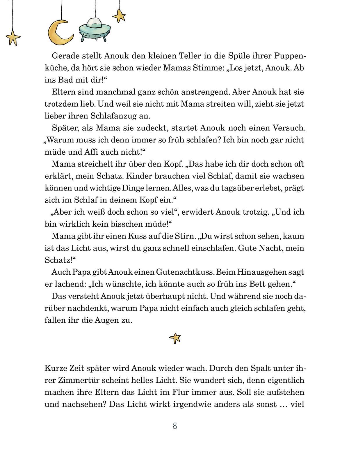 Anouk ist liebenswert und hilfsbereit. Nur eines mag sie gar nicht: Schlafengehen! Umso mehr wundern sich ihre Eltern, als Anouk plötzlich voller Vorfreude abends zu Bett geht. Denn was sie nicht wissen: Nacht für Nacht erlebt Anouk neuerdings aufregende Abenteuer. Erzählt sie am nächsten Tag davon, sagen ihre Eltern: "Schatz, das hast du alles nur geträumt!" Doch Anouk hat "Beweise" dafür, dass das nicht so ist ...