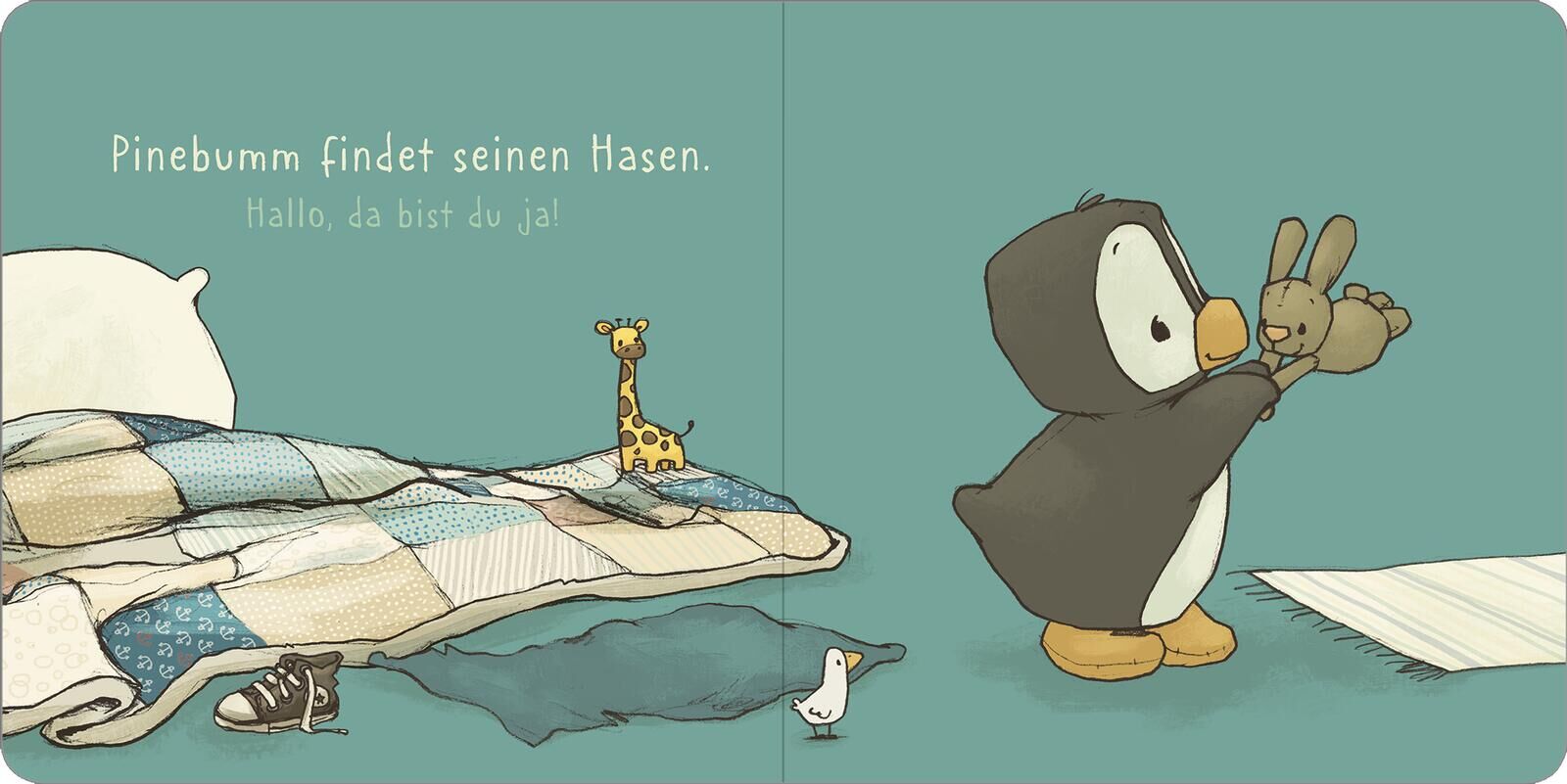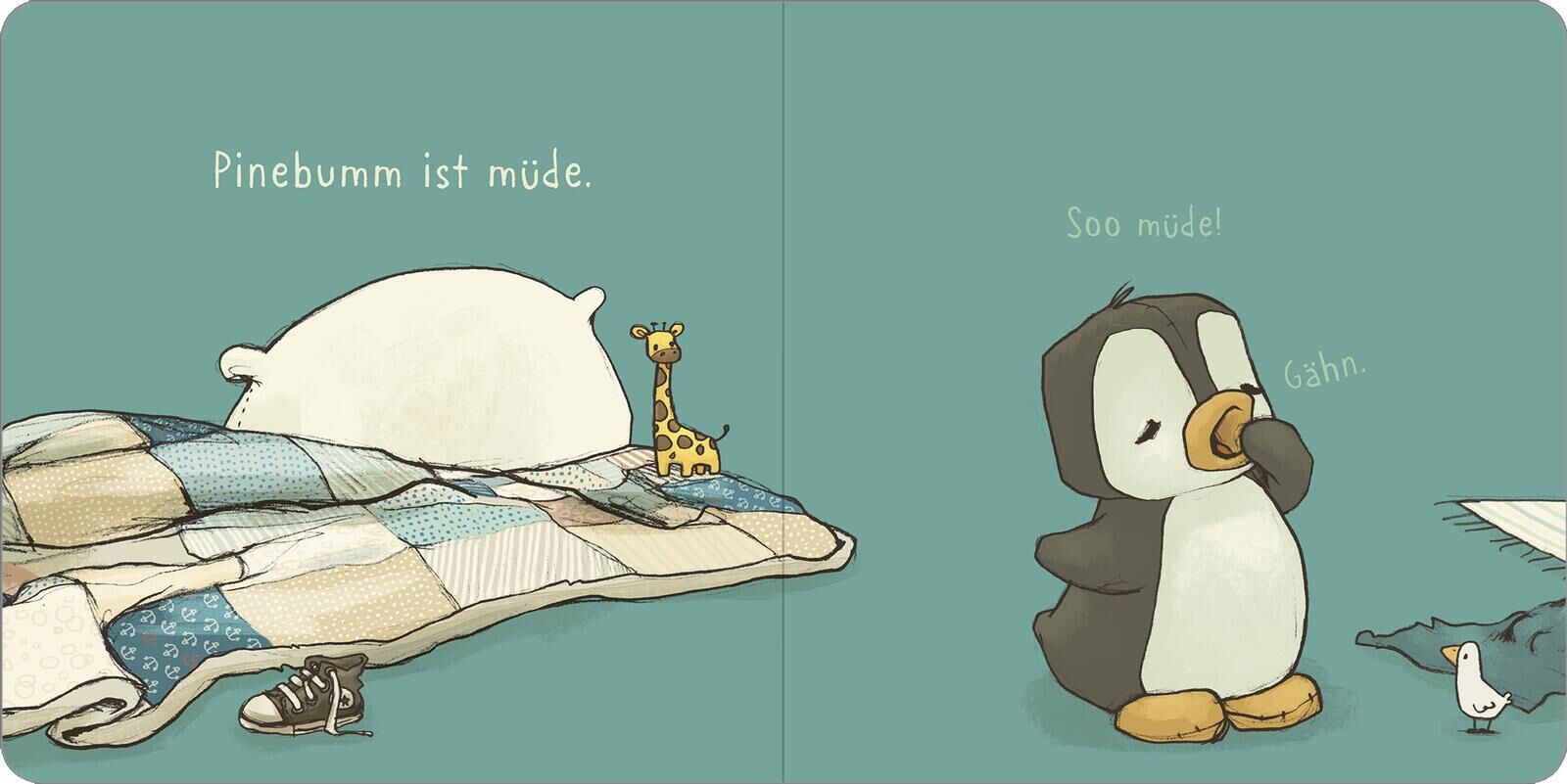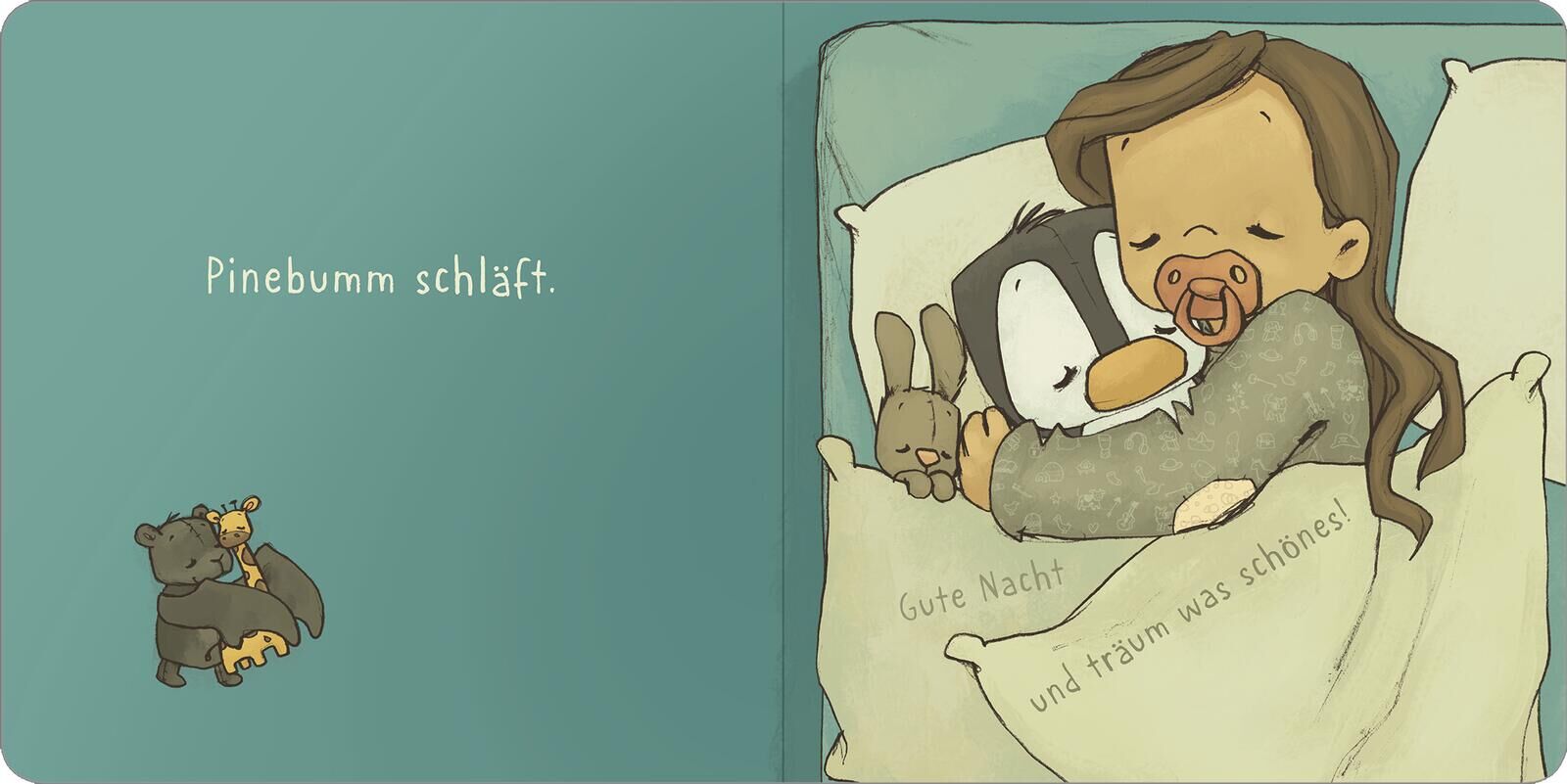 Hier kommt Pinebumm! Pinebumm, der kleine Pinguin, ist müde. Soo müde! Zuerst sucht er seinen Kuschelhasen, dann schmiegt er sich in sein warmes Bett. Und was braucht Pinebumm zum Einschlafen natürlich noch unbedingt? Richtig - einen dicken Kuss von Anouk! Ei...