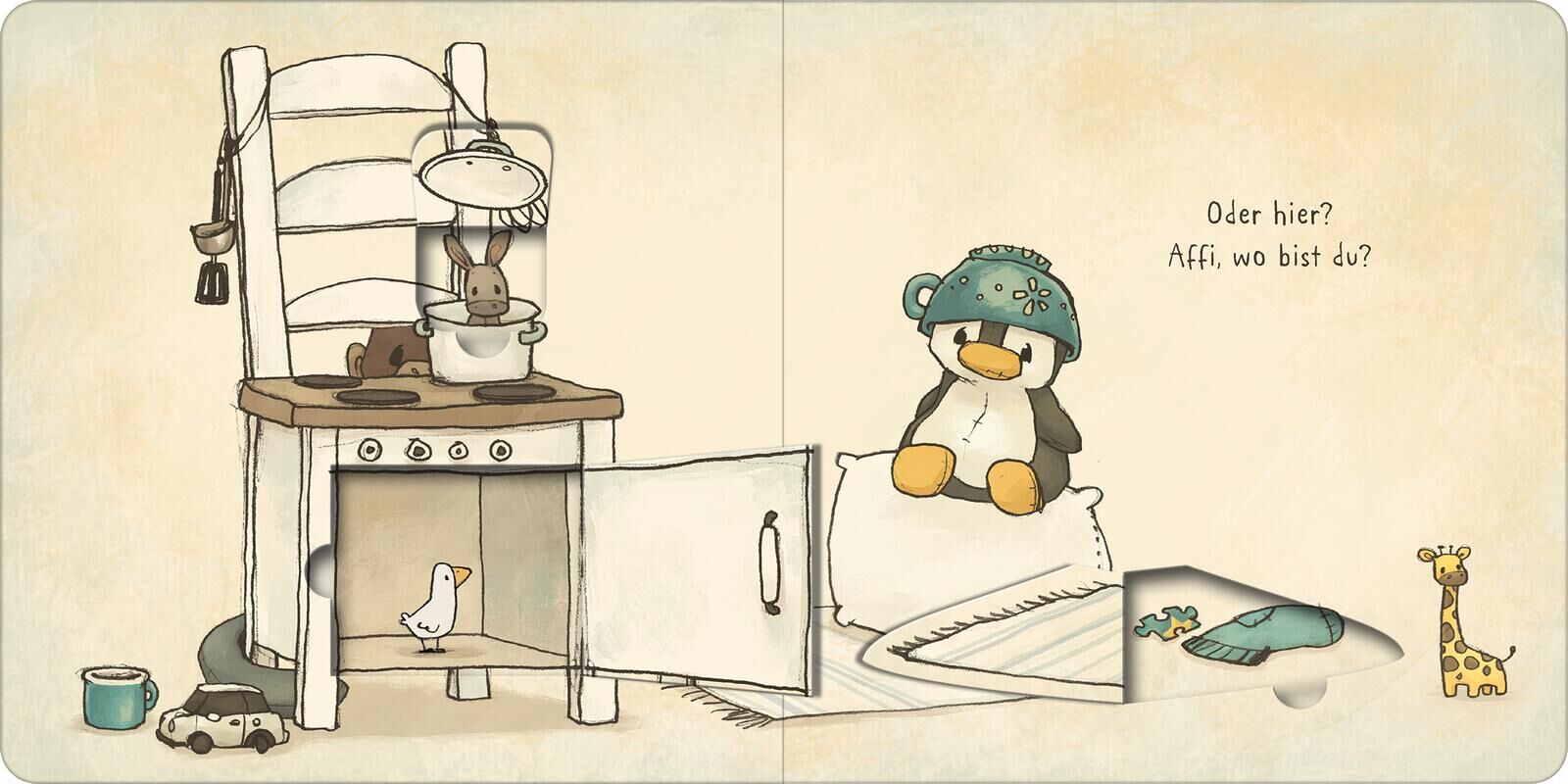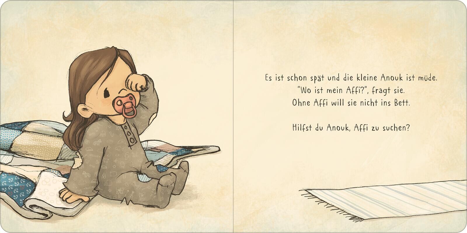 Affi, wo bist du? Anouk ist müde und will ins Bett. Doch wo ist ihr Kuscheltier? Eben war Affi doch noch da! Wo könnte er nur sein? Hinter der Pflanze? Unter dem Kissen? Sie kann ihn nirgends finden. Hilfst du Anouk bei der Suche? Denn ohne ihren Affi geht si...Affi, wo bist du?