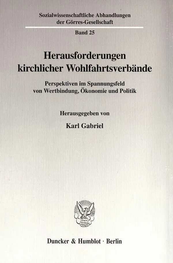 Inhalt: K. Gabriel, Einleitung - M. N. Ebertz, Entstehungsbedingungen der »Sozialkirche« im deutschen Katholizismus - J.-C. Kaiser, Sozialer Protestantismus als kirchliche »Zweitstruktur«: Entstehungskontext und Entwicklungslinien der Inneren Mission - F. Fürstenberg, Die Zukunft der Sozialreligion und ihrer Organisationsformen - K. Gabriel, Die soziale Herausforderung des Sozialstaats und die kirchlichen Wohlfahrtsverbände - K. Hilpert, Neue Rollen der Caritas im Kontext der Transformation des Wohlfahrtsstaates - V. Krech, Religiöse Programmatik und diakonisches Handeln. Erwägungen zur Spezifik kirchlicher Wohlfahrtsverbände - D. Grunow, Organisationsdilemmata kirchlicher Wohlfahrtsverbände im gesellschaftlichen Umbruch - J. Wiemeyer, Ökonomische Herausforderungen für kirchliche Wohlfahrtsverbände - M. Hermanns, Die karitativen Dienste im Spannungsfeld von Wirtschaftlichkeit und Wertevergewisserung - J. Schmid, Europäische Integration und die Zukunft der kirchlichen Wohlfahrtsverbände in Deutschland