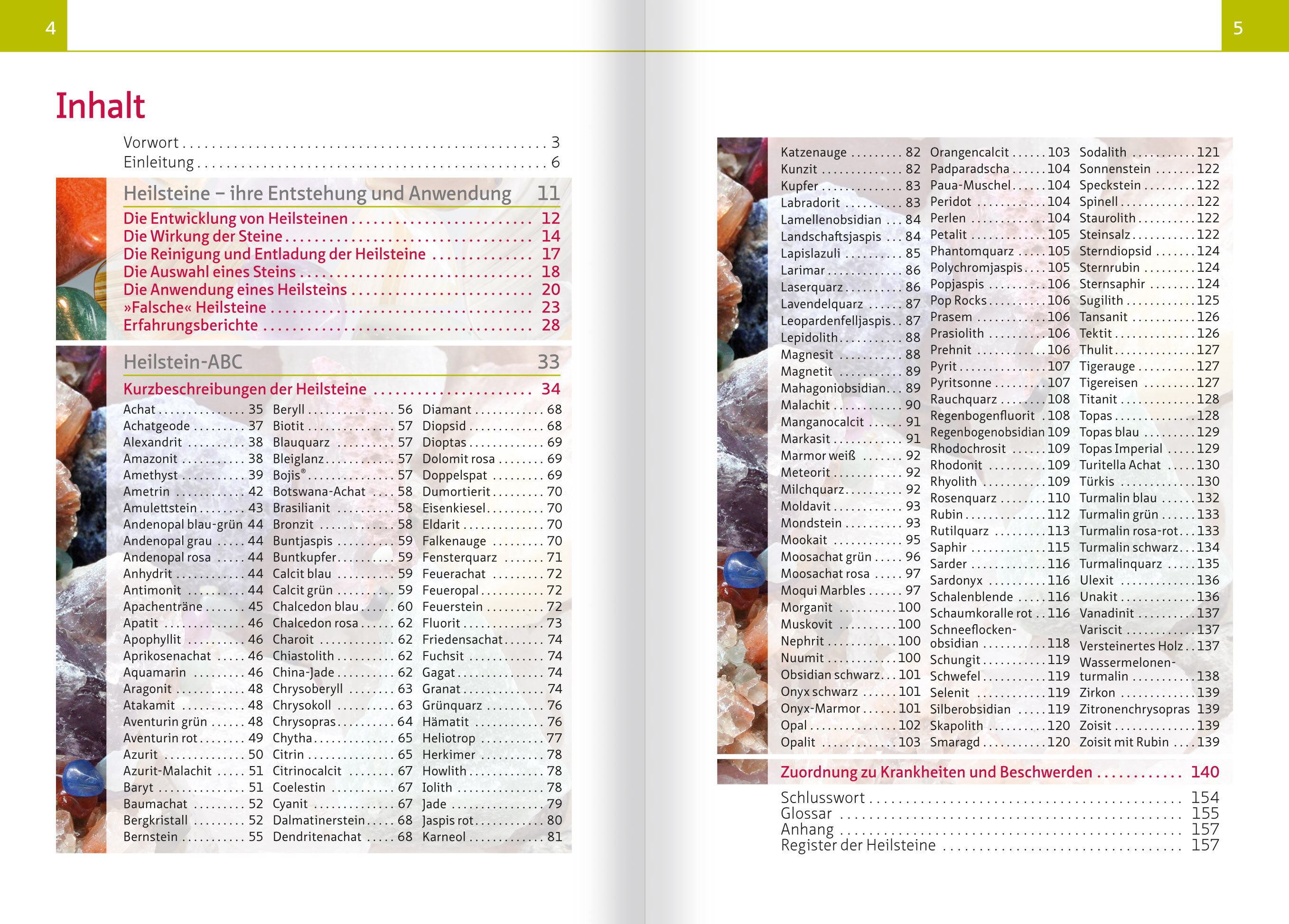 INHALT Vorwort Einleitung HEILSTEINE - IHRE ENTSTEHUNG UND ANWENDUNG Die Entwicklung von Heilsteinen Die Wirkung der Steine Die Reinigung und Entladung der Heilsteine Die Auswahl eines Steins Die Anwendung eines Heilsteins »Falsche« Heilsteine Erfahrungsberichte HEILSTEIN-ABC Kurzbeschreibungen der Heilsteine - Achat - Achatgeode - Alexandrit - Amazonit - Amethyst - Ametrin - Amulettstein - Andenopal blau-grün - Andenopal grau - Andenopal rosa - Anhydrit - Antimonit - Apachenträne - Apatit - Apophyllit - Aprikosenachat - Aquamarin - Aragonit - Atakamit - Aventurin grün - Aventurin rot - Azurit - Azurit-Malachit - Baryt - Baumachat - Bergkristall - Bernstein - Beryll - Biotit - Blauquarz - Bleiglanz - Bojis® - Botswana-Achat - Brasilianit - Bronzit - Buntjaspis - Buntkupfer - Calcit blau - Calcit grün - Chalcedon blau - Chalcedon rosa - Charoit - Chiastolith - China-Jade - Chrysoberyll - Chrysokoll - Chrysopras - Chytha - Citrin - Citrinocalcit - Coelestin - Cyanit - Dalmatinerstein - Dendritenachat - Diamant - Diopsid - Dioptas - Dolomit rosa - Doppelspat - Dumortierit - Eisenkiesel - Eldarit - Falkenauge - Fensterquarz - Feuerachat - Feueropal - Feuerstein - Fluorit - Friedensachat - Fuchsit - Gagat - Granat - Grünquarz - Hämatit - Heliotrop - Herkimer - Howlith - Iolith - Jade - Jaspis rot - Karneol - Katzenauge - Kunzit - Kupfer - Labradorit - Lamellenobsidian - Landschaftsjaspis - Lapislazuli - Larimar - Laserquarz - Lavendelquarz - Leopardenfelljaspis - Lepidolith - Magnesit - Magnetit - Mahagoniobsidian - Malachit - Manganocalcit - Markasit - Marmor weiß - Meteorit - Milchquarz - Moldavit - Mondstein - Mookait - Moosachat grün - Moosachat rosa - Moqui Marbles - Morganit - Muskovit - Nephrit - Nuumit - Obsidian schwarz - Onyx schwarz - Onyx-Marmor - Opal - Opalit - Orangencalcit - Padparadscha - Paua-Muschel - Peridot - Perlen - Petalit - Phantomquarz - Polychromjaspis - Popjaspis - Pop Rocks - Prasem - Prasiolith - Prehnit - Pyrit - Pyritsonne - Rauchquarz - Regenbogenfluorit - Regenbogenobsidian - Rhodochrosit - Rhodonit - Rhyolith - Rosenquarz - Rubin - Rutilquarz - Saphir - Sarder - Sardonyx - Schalenblende - Schaumkoralle rot - Schneeflockenobsidian - Schungit - Schwefel - Selenit - Silberobsidian …