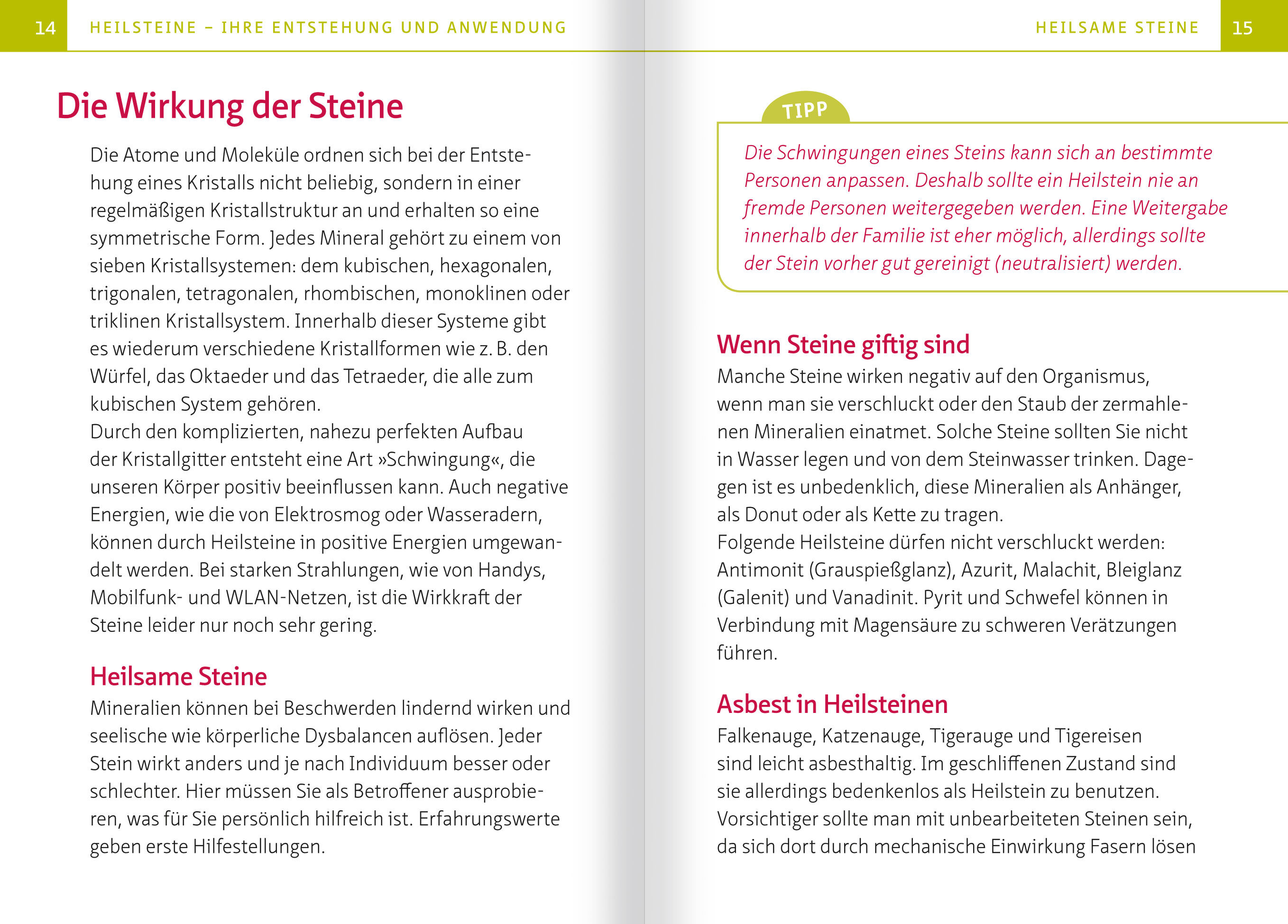 ((Auszug aus dem Kapitel "Die Wirkung der Steine")) DIE WIRKUNG DER STEINE Die Atome und Moleküle ordnen sich bei der Entstehung eines Kristalls nicht beliebig, sondern in einer regelmäßigen Kristallstruktur an und erhalten so eine symmetrische Form. Jedes Mineral gehört zu einem von sieben Kristallsystemen: dem kubischen, hexagonalen, trigonalen, tetragonalen, rhombischen, monoklinen oder triklinen Kristallsystem. Innerhalb dieser Systeme gibt es wiederum verschiedene Kristallformen wie z. B. den Würfel, das Oktaeder und das Tetraeder, die alle zum kubischen System gehören. Durch den komplizierten, nahezu perfekten Aufbau der Kristallgitter entsteht eine Art »Schwingung«, die unseren Körper positiv beeinflussen kann. Auch negative Energien, wie die von Elektrosmog oder Wasseradern, können durch Heilsteine in positive Energien umgewandelt werden. Bei starken Strahlungen, wie von Handys, Mobilfunk- und WLAN-Netzen, ist die Wirkkraft der Steine leider nur noch sehr gering. Heilsame Steine Mineralien können bei Beschwerden lindernd wirken und seelische wie körperliche Dysbalancen auflösen. Jeder Stein wirkt anders und je nach Individuum besser oder schlechter. Hier müssen Sie als Betroffener ausprobieren, was für Sie persönlich hilfreich ist. Erfahrungswerte geben erste Hilfestellungen. (...) ((Auszug aus dem Kapitel "Heilstein-ABC")) ACHAT Familie: Quarz-Gruppe Farbe: unterschiedlich, wird oft blau, grün, rot oder pink gefärbt Härte: 6,57 Fördert: Ruhe, Geborgenheit, geistige Reife, Menschenkenntnis, Fantasie Wirkt auf: Magen, Darm, innere Organe, Gebärmutter, ist hilfreich und schützend bei der Schwangerschaft Wirkt gegen: Epilepsie In der Antike wurde der Achat oft als Schutzamulett getragen. Ihm wurden auch Glück bringende Wirkungen zugeschrieben, wobei sich das meist auf das Seelenglück bezogen hat. Der Achat gibt uns Geborgenheit und ein Gefühl von Behaglichkeit. Besonders Kinder finden in der Achatgeode (R Seite 37) Ruhe und Schutz. Ziellose, unausgeglichene Menschen lässt der Achat wieder zu sich selbst finden und die sie umgebende Hektik und Gefühllosigkeit vergessen. Der Achat fördert das gefühlvolle, realistische und positive Denken, wodurch wir im geistigen Bereich reifer (überlegter) werden und mit der Vielzahl an Dingen, die auf uns einströmen, besser zurechtkommen können. Durch seine vielfältigen Formen und Farben fördert der Achat die Fantasie. Ebenso stärkt er unser Einfühlungsvermögen und lässt uns dadurch andere Menschen leichter verstehen. Im Bereich des Magens und des Darms löst der Achat Blockaden und fördert die Regeneration. Dabei sollte man sich einen Achat auf den Bauch legen oder ihn in der Hosentasche bei sich tragen. Der Achat, und ganz besonders der Aprikosenachat, hilft vielen Frauen in der Schwangerschaft und bietet zudem Schutz für das ungeborene Leben. Auch bei Gebärmuttererkrankungen ist er hilfreich, da er die Zellregenerierung unterstützt. Der weiße Achat (Friedensachat) hat durch seine reine weiße Farbe eine friedliche und beruhigende Wirkung, die den Kopf und das Herz von schweren Lasten befreit. Er erlöst uns von Beklemmungen, Hektik und Unruhe und fördert klares, ruhiges Denken. Achtung! Der Achat wird sehr oft eingefärbt. In der Natur kommt er nicht dunkelblau, grün, rot oder pink vor. (...)