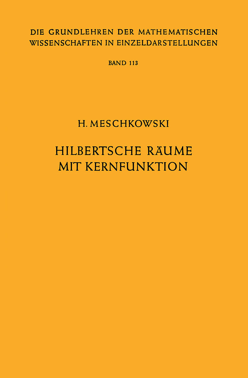 Erstes Kapitel. Einleitung.- Zweites Kapitel. Allgemeine Eigenschaften der Hilbertschen Räume.- § 1. Definitionen.- § 2. Die Orthogonalisierung.- §3. Abgeschlossenheit und Vollständigkeit.- § 4. Separierbarkeit von Hilbertschen Räumen.- § 5. Beispiele.- § 6. Unterräume.- § 7. Lineare Funktionale.- § 8. Lineare Operatoren.- § 9. Eigenwertprobleme für vollstetige Operatoren.- §10. Der Wurzeloperator für symmetrische positive Operatoren.- Drittes Kapitel. Der reproduzierende Kern.- § 1. Grundlegende Eigenschaften.- § 2. Separierbarkeit von Räumen mit Kernfunktion.- § 3. Operatoren in Räumen mit Kernfunktion.- § 4. Ergänzung unvollständiger Räume.- § 5. Vollständige Systeme.- Viertes Kapitel. Beispiele von Hilbertschen Räumen mit reproduzierendem Kern.- § 1. Integralsätze.- § 2. Die Bergmansche Kernfunktion.- § 3. Der reproduzierende Kern für Lösungsfunktionen von partiellen Differentialgleichungen.- § 4. Der Bergman-Kern und die Green-Funktion.- § 5. Approximierung durch rationale Funktionen.- § 6. Der reproduzierende Kern für harmonische Funktionen.- § 7. Der Szegö-Kern.- § 8. Der Bergman-Kern für Funktionen mit mehreren Veränderlichen..- § 9. Die Abhängigkeit der Funktion K(x, x) vom Gebiet.- Fünftes Kapitel. Die Hilbert-Räume positiver Matrizen.- § 1. Positive Matrizen.- § 2. Die Summe zweier Kernfunktionen.- § 3. Die Differenz von Kernen.- § 4. Das Produkt zweier Kernfunktionen.- § 5. Konvergente Folgen von Kernfunktionen.- Sechstes Kapitel. Orthonormalsysteme mit speziellen Eigenschaften.- §1. Interpolation bei endlich vielen Punkten.- § 2. Abzählbar viele Interpolationspunkte.- § 3. Eine Eigenschaft des Bergman-Systems.- § 4. Orthogonalisierung mit Gewichtsfunktionen.- Siebentes Kapitel. Normalabbildungen.- §1. Die Parallelschlitzabbildung.- §2. Die Radial-und Kreisschlitzabbildung.- §3. Die Abbildung auf einen beschränkten Kreisschlitzbereich.- § 4. Beschränkte Funktionen.- § 5. Der Bildbereich von N(z, u).- Achtes Kapitel. Die Darstellung von Funktionen.- § 1. Szegö-Systeme für Funktionen mit Polen.- §2. Darstellung durch Bergman-Systeme.- § 3. Das Poisson-Integral für mehrfach zusammenhängende Bereiche.- §. Weitere Verallgemeinerungen l6l.- § 5. Darstellung durch den Randwinkel.- § 6. Darstellung durch Kerne mit Gewichtsfunktion.- § 7. Abbildung auf den Einheitskreis.- Neuntes Kapitel. Extremalprobleme.- § 1. Eine Eigenschaft der Funktion N'm (z, u).- § 2. Verzerrungssätze für schlichte Funktionen.- §3. Verallgemeinerung des Bieberbachschen Flächensatzes.- § 4. Extremalsätze für den Szegö-Kern.- § 5. Schlichtheitsschranken.- §6. Abschätzung von Restgliedern.- Zehntes Kapitel. Doppelte Orthogonalität.- § 1. Beispiele für vollstetige Operatoren in den Räumen HS und H(B).- § 2. Die zweite Orthogonalitätsrelation.- § 3. Die Vielfachheit des ersten Eigenwertes.- § 4. Eigenschaften quadratischer Formen.- § 5. Beispiele und Verallgemeinerungen.- § 6. Typen von Orthonormalsystemen.- § 7. Ein Approximationsproblem.- § 8. Eigenschaften der Transformation T(B) f.- Elftes Kapitel. Hilbert-Räume aus Lösungen elliptischer Differentialgleichungen.- §1. Definition eines inneren Produktes.- § 2. Hilfssätze.- § 3. Randwertprobleme.- § 4. Fundamentale Singularitäten.- § 5. Die Kernfunktion.- Zwölftes Kapitel. Kernfunktionen in der Theorie der Funktionen von mehreren komplexen Veränderlichen.- § 1. Definitionen und grundlegende Sätze.- § 2. Anwendung der Kernfunktion.- § 3. Minimalbereiche.- §4. Kernfunktion und Hüllenbildung.-§ 5. Die analytische Fortsetzung quadratintegrabler Funktionen.- § 6. Kern und Außenhülle.- § 7. Die allgemeine Bergmansche Metrik und ihre Fortsetzbarkeit.- Namen- und Sachregister.