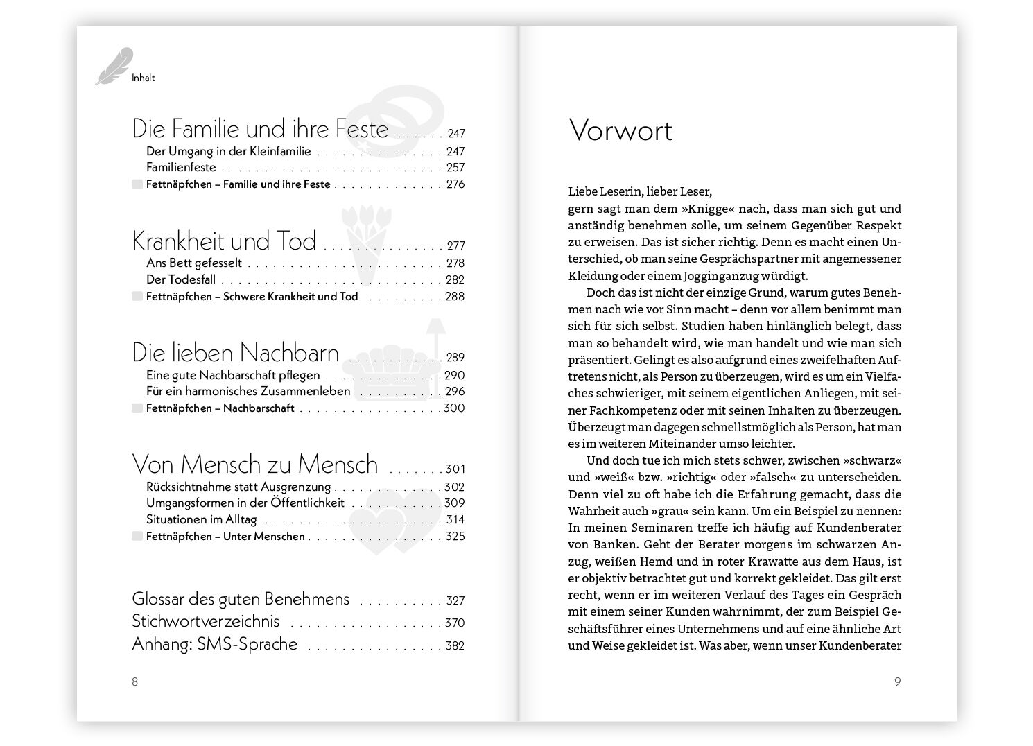 VORWORT Liebe Leserin, lieber Leser, gern sagt man dem "Knigge" nach, dass man sich gut und anständig benehmen solle, um seinem Gegenüber Respekt zu erweisen. Das ist sicher richtig. Denn es macht einen Unterschied, ob man seine Gesprächspartner mit angemessener Kleidung oder einem Jogginganzug würdigt. Doch das ist nicht der einzige Grund, warum gutes Benehmen nach wie vor Sinn macht denn vor allem benimmt man sich für sich selbst. Studien haben hinlänglich belegt, dass man so behandelt wird, wie man handelt und wie man sich präsentiert. Gelingt es also aufgrund eines zweifelhaften Auftretens nicht, als Person zu überzeugen, wird es um ein Vielfaches schwieriger, mit seinem eigentlichen Anliegen, mit seiner Fachkompetenz oder mit seinen Inhalten zu überzeugen. Überzeugt man dagegen schnellstmöglich als Person, hat man es im weiteren Miteinander umso leichter. Und doch tue ich mich stets schwer, zwischen "schwarz" und "weiß " bzw. "richtig" oder "falsch" zu unterscheiden. Denn viel zu oft habe ich die Erfahrung gemacht, dass die Wahrheit auch "grau" sein kann. Um ein Beispiel zu nennen: In meinen Seminaren treffe ich häufig auf Kundenberater von Banken. Geht der Berater morgens im schwarzen Anzug, weißen Hemd und in roter Krawatte aus dem Haus, ist er objektiv betrachtet gut und korrekt gekleidet. Das gilt erst recht, wenn er im weiteren Verlauf des Tages ein Gespräch mit einem seiner Kunden wahrnimmt, der zum Beispiel Geschäftsführer eines Unternehmens und auf eine ähnliche Art und Weise gekleidet ist. Was aber, wenn unser Kundenberater im Anschluss einen weiteren Kunden besucht, der nun nicht hinter dem Schreibtisch agiert, sondern einen landwirtschaftlichen Hof betreibt? Dieser Kunde begegnet dem Bankmitarbeiter in Gummistiefeln und Jeans. Plötzlich ist die akkurate Kleidung des Bankers geeignet, Distanzen zu schaffen. Dieses Beispiel zeigt, warum die Wahrheit auch zwischen den Extremen liegen kann. Es gibt Situationen, in denen "zu viel" des Guten auch unfreiwillig Kluften schlagen kann. Daher werde ich nie müde zu betonen, dass Sie das Wichtigste in puncto "Umgangsformen" bereits besitzen und das ist Ihr Fingerspitzengefühl; Ihr feines Gespür für die jeweilige Situation und für das, was Ihr Gegenüber von Ihnen erwartet. Dennoch meine ich, dass man möglichst viele der zahlreichen Regeln kennen sollte, um zu entscheiden, wo man welche Spielregeln zum Einsatz bringen möchte. Ich wünsche Ihnen, dass Ihnen genau hierbei dieses Buch ein treuer Ratgeber sein wird. Ihre Carolin Lüdemann Mitglied im Deutschen Knigge-Rat
