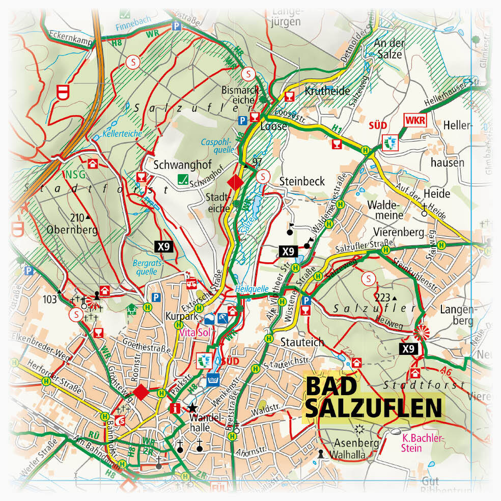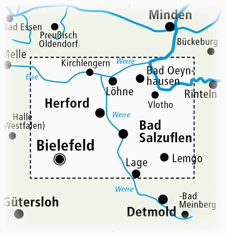 Die Rad- und Wanderkarte Herford - Bad Oeynhausen - Bad Salzuflen zeigt das Gebiet nordöstlich von Bielefeld. Über zahlreiche Rad- und Wanderwege lässt sich die Region am Naturpark Nördlicher Teutoburger Wald wunderbar erkunden. Entlang von Werre, Else und Wes...