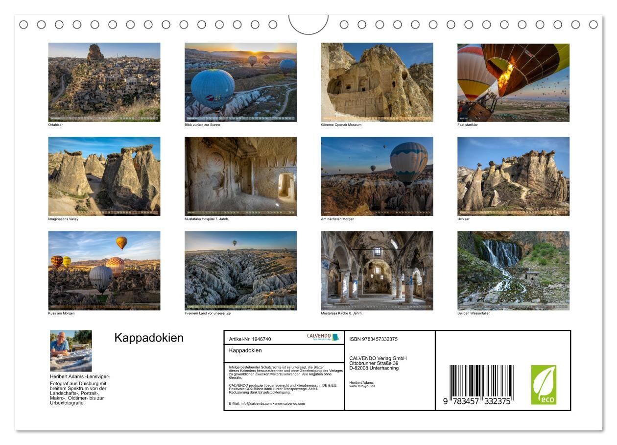 Erleben Sie das Faszinierende von Kappadokien in einem atemberaubenden Kalender! Tauchen Sie ein in die magische Welt dieser historisch und spirituell bedeutsamen Region, wo Geschichte, Kultur und Landschaft zusammen mit einer Ballonfahrt zu einem unvergesslic...
