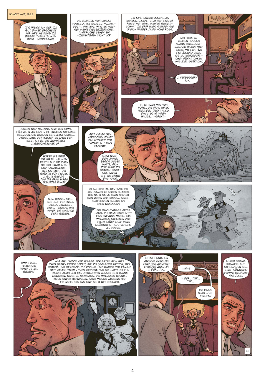 Großbritannien, 1922. Ernest Patisson, der berühmte Schweizer Globetrotter, wurde für ein Wochenende auf eine entlegene schottische Insel eingeladen. Captain Phillips wüsste zu gern, was der befreundete Detektiv über das Leiden denkt, von dem die Herrin des do...