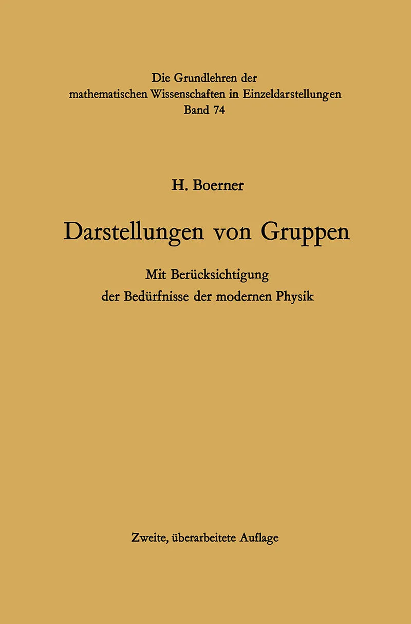 I. Kapitel Matrizen.- § 1. Vektoren.- §2. Lineare Abbildungen. Matrizen.- § 3. Algebren.- § 4. Quadratische und hermitesche Formen, orthogonale und unitäre Matrizen.- § 5. Eigenwerte und Transformation auf Diagonalgestalt.- § 6. Zwei weitere Verknüpfungen für Matrizen; das Kronecker-Produkt.- § 7. Äquivalenz und Reduzibilität von Matrixsystemen. Das Lemma von Schur.- § 8. Vertauschbarkeit von Matrixsystemen.- § 9. Beispiele irreduzibler Systeme. Eine Anwendung des Schurschen Lemmas.- II. Kapitel Gruppen.- § 1. Elementare Gruppentheorie.- § 2. Die symmetrische und die alternierende Gruppe.- § 3. Kontinuierliche Gruppen.- § 4. Die Matrix-Exponentialfunktion.- §5. Der Infinitesimalring einer linearen Gruppe.- § 6. Integration in Lieschen Gruppen.- III. Kapitel Allgemeine Darstellungstheorie.- § 1. Begriff der Darstellung. Die vollständige Reduzibilität der Darstellungen endlicher Gruppen. Eindeutigkeit der Zerlegung.- § 2. Der Gruppenring und die reguläre Darstellung.- § 3. Struktur des Gruppenrings. Vorbereitende Sätze.- § 4. Die Struktur des Gruppenrings und das System der Klassen irreduzibler Darstellungen.- § 5. Zur Darstellungstheorie der halbeinfachen Algebren.- § 6. Normale Darstellungen.- § 7. Die Charaktere.- § 8. a) Charaktere und Gruppenring.- § 9. Die infinitesimalen Transformationen der Darstellungen kontinuierlicher Gruppen.- § 10. Die adjungierte Darstellung.- § 11. Die Charaktere der kontinuierlichen Gruppen.- § 12. Strahldarstellungen.- § 13. Gruppe und Untergruppe.- IV. Kapitel Die Darstellungen der symmetrischen Gruppe.- § 1. Die Tableaux.- § 2. Hilfssätze über die Tableaux.- § 3. Die irreduziblen Darstellungen.- § 4. Die Standard-Tableaux. Volle Reduktion des Gruppenrings.- § 5. Youngs seminormaleDarstellung.- § 6. Youngs orthogonale Darstellung.- § 7. Beweis der Sätze 4.2 und 4.3.- V. Kapitel Die Darstellungen der vollen linearen, unimodularen und unitären Gruppen.- § 1. Vorbemerkungen.- § 2. Das Kronecker-Quadrat und die symmetrischen und schiefsymmetrischen Tensoren zweiter Stufe.- § 3. Der Raum der Tensoren v-ter Stufe und die Darstellungen der Gruppe Gn vom Polynomgrad v.- § 4. Die Symmetrieklassen im Tensorraum.- § 5. Die Tableaux und die ganzrationalen Darstellungen der vollen linearen Gruppe.- § 6. Der Verzweigungssatz.- § 7. Ganzrationale Darstellungen der reellen linearen, unimodularen und unitären Gruppen.- § 8. Rationale und semirationale Darstellungen.- § 9. Die unzerfällbaren Darstellungen der additiven Gruppe der reellen Zahlen.- § 10. Die stetigen Darstellungen der vollen und reellen linearen, der unimodularen und unitären Gruppen.- VI. Kapitel Charaktere der linearen und der Permutationsgruppen. Die alternierende Gruppe.- § 1. Die Charakteristiken und die Darstellungsgrade der ganzrationalen Darstellungen der vollen linearen Gruppe.- § 2. Zusammenhang zwischen den Charakteren der symmetrischen Gruppe und den Charakteristiken der vollen linearen Gruppe.- § 3. Zur Berechnung der Charaktere der symmetrischen Gruppe. Übersicht über die Darstellungen der alternierenden Gruppe.- § 4. Noch eine Formel zur Berechnung der Charaktere von Sv.- § 5. Analyse von Kronecker-Produkten bei der symmetrischen und bei der vollen linearen Gruppe.- § 6. Die Charaktere der alternierenden Gruppe.- VII. Kapitel Charaktere und eindeutige Darstellungen der Drehgruppe.- § 1. Zusammenhangsverhältnisse der Drehgruppe.- § 2. Das Toroid 𝔗p.- § 3. Das Stiefeische Diagramm.- § 4. Die Gruppe ?.- § 5. Die Fundamentalbereiche der Gruppe ?.-§ 6. Die Eigenwerte der Darstellungen.- §7. Die Eigenwerte der adjungierten Darstellung.- § 8. Das Integral über eine Klassenfunktion.- § 9. Invariante und alternierende Polynome und Elementarsummen.- § 10. Das System der einfachen Charaktere.- § 11. Der Darstellungsgrad.- § 12. Der Verzweigungssatz.- § 13. Anwendung auf die niedersten Dimensionszahlen.- § 14. Die Fundamentaldarstellungen.- § 15. Die volle orthogonale Gruppe.- VIII. Kapitel Spindarstellungen, Infinitesimalring, gewöhnliche Drehgruppe.- § 1. Der Infinitesimalring der Drehgruppe.- § 2. Cliffords Algebra und ihr Zusammenhang mit den infinitesimalen Drehungen.- § 3. Darstellungstheorie der Cliffordschen Algebra.- § 4. Die Spindeldarstellungen des Infinitesimalrings der Drehgruppe.- § 5. Die Spindeldarstellungen der Drehgruppe.- § 6. Die gewöhnliche Drehgruppe d3.- § 7. Die Formel von Clebsch-Gordan.- § 8. Struktur des Infinitesimalrings und Gewichte der Darstellungen.- § 9. Weitere Kronecker-Produkte. Algebra von Kemmer und de Broglie.- IX. Kapitel Die Lorentz-Gruppe.- § 1. Di…