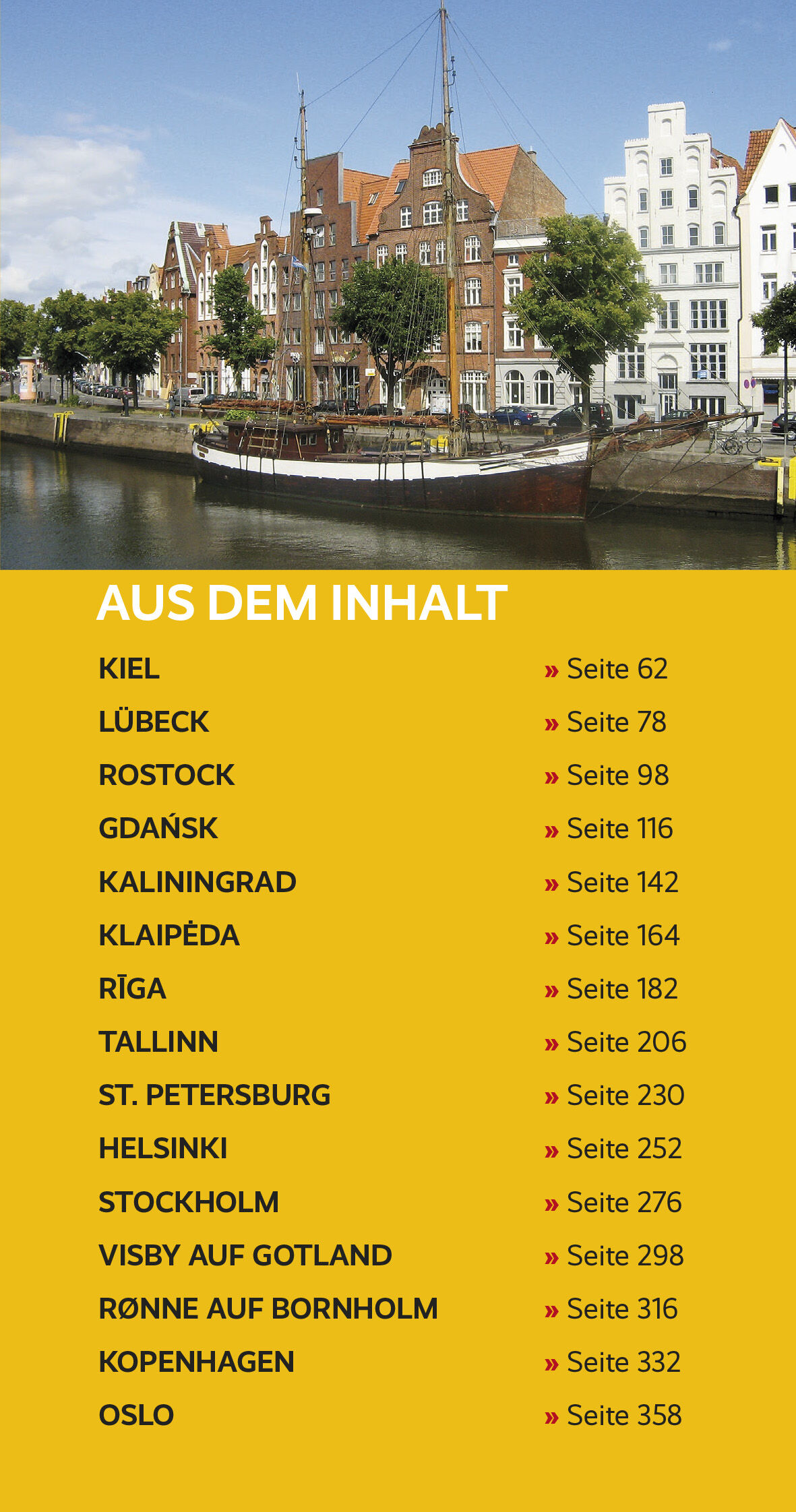Vorwort 11 Das Wichtigste in Kürze 12 Tipps für Kreuzfahrtreisende 14 Routentipps für Individualreisende 19 LÄNDER UND LEUTE 22 Die Ostsee als Naturraum 24 Geographische Gliederung 24 Entstehung der Ostsee 26 Labiles Ökosystem 28 Die Tierwelt 30 Geschichte der Ostseeregion 32 Die Wikinger 32 Dänisches Ostseereich, Deutscher Orden und Hanse 33 Reformation und Dreißigjähriger Krieg 36 Vom Aufstieg Russlands bis zur Revolution 38 Machtkampf in Europa 39 Die Ostsee zur Zeit der Weltkriege 39 Kalter Krieg und Zerfall der politischen Blöcke 40 Politische und wirtschaftliche Zusammenarbeit 41 Ländersteckbriefe 44 KIEL 62 Stadtgeschichte 64 Stadtrundgang 68 Kiel-Informationen 73 Ausflüge Nord-Ostsee-Kanal 76 Laboe 76 Freilichtmuseum Molfsee 76 LÜBECK 78 Stadtgeschichte 80 Stadtrundgang 83 Lübeck-Informationen 91 Ausflüge Travemünde 94 ROSTOCK 98 Stadtgeschichte 100 Stadtrundgänge 103 Die westliche Altstadt 103 Die östliche Altstadt 106 Rostock-Informationen 108 Ausflüge Warnemünde 112 GDASK 116 Stadtgeschichte 119 Stadtrundgang 123 Gdask-Informationen 127 Ausflüge Westerplatte, Stutthof 132 Sopot 132 Gdynia 138 KALININGRAD 142 Stadtgeschichte 144 Stadtrundgänge 148 Dominsel, Fischdorf und Friedländer Tor 148 Hafen, Bernsteinmuseum, Siegesplatz und Zoo 151 Kaliningrad-Informationen 155 Ausflüge Seebäder 159 Kurische Nehrung 160 KLAIPDA 164 Stadtgeschichte 166 Stadtrundgang 170 Altstadt 170 Nördlich der Dan 173 Alter Hafen und Smiltyn 175 Klaipda-Informationen 177 Ausflüge Nida auf der Kurischen Nehrung 180 Palanga 181 RGA 182 Stadtgeschichte 184 Stadtrundgang 188 Rga-Informationen 198 Ausflüge Jrmala 204 Gauja-Nationalpark 205 TALLINN 206 Stadtgeschichte 208 Stadtrundgang 214 Unterstadt 217 Alter Markt und Rotermann-Quartier 219 Kalamaja 220 Kadriorg 223 Maarjamäe 224 Pirita 224 Zoo/Estnisches Freilichtmuseum 224 Tallinn-Informationen 225 ST. PETERSBURG 230 Stadtgeschichte 232 Stadtrundgang 236 Nevskij-Prospekt 236 Palastplatz 240 Peter-und-Paul-Festung 241 Heumarktviertel 242 Der südliche Nevskij-Prospekt 243 St.-Petersburg-Informationen 245 Ausflüge Carskoe Selo 250 Peterhof 250 HELSINKI 252 Stadtgeschichte 254 Stadtrundgang 261 Ausflüge Kaivopuisto 266 Suomenlinna 266 Seurasaari 268 Helsinki-Informationen 269 STOCKHOLM 274 Stadtgeschichte 276 Stadtrundgänge 279 Altstadt 279 Helgelandsholmen 283 Blasieholmen, Skeppsholmen, Kastellholmen 283 Djurgården 284 Stockholm-Informationen 288 Ausflüge Skulpturenpark Millesgården 294 Friedhof Skogskyrkogården 294 Schloss Drottningholm 295 VISBY AUF GOTLAND 296 Geschichte 298 Stadtrundgang 300 Stadtmauer und Park 303 Visby-Informationen 307 Ausflüge Gotlandbahn und Eisenbahnmuseum 312 Freizeitpark Kneippbyn 312 RØNNE AUF BORNHOLM 314 Geschichte 316 Stadtrundgang 320 Rønne-Informationen 325 Ausflüge Allinge-Sandvig, Hasle 327 Rundkirchen 327 Gudhjem 328 Nexø 329 KOPENHAGEN 330 Stadtgeschichte 332 Stadtspaziergang 338 Kopenhagen-Informationen 348 Ausflüge Humlebæk 354 Frederiksborg 354 Roskilde 354 Malmö 354 Bornholm 355 OSLO 356 Stadtgeschichte 359 Stadtrundgänge 361 Das königliche Zentrum 361 Aker Brygge und Tjuvholmen 366 Grünerløkka 367 Grønland/Tøyen 367 Oslo-Informationen 369 Ausflüge S…
