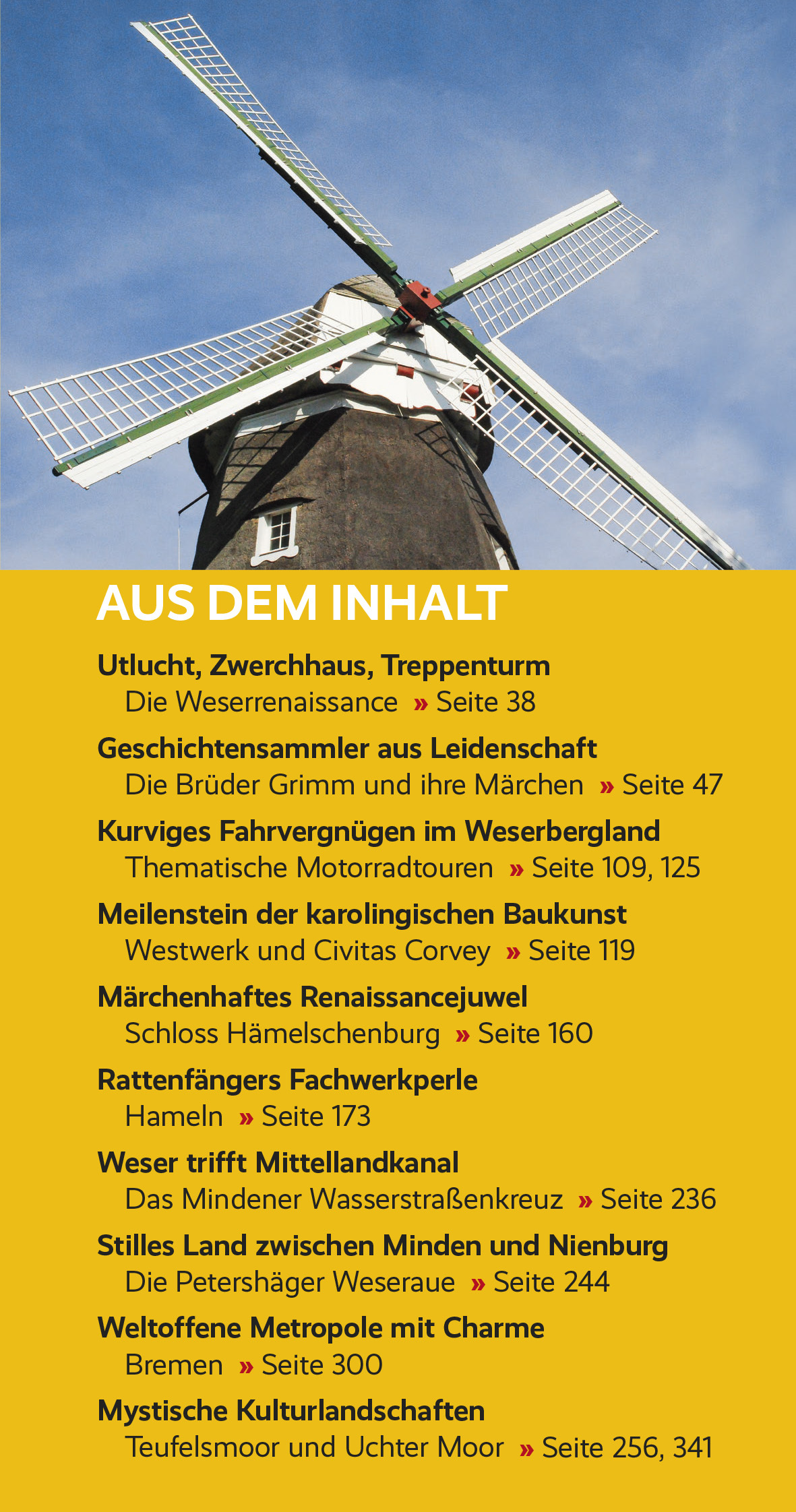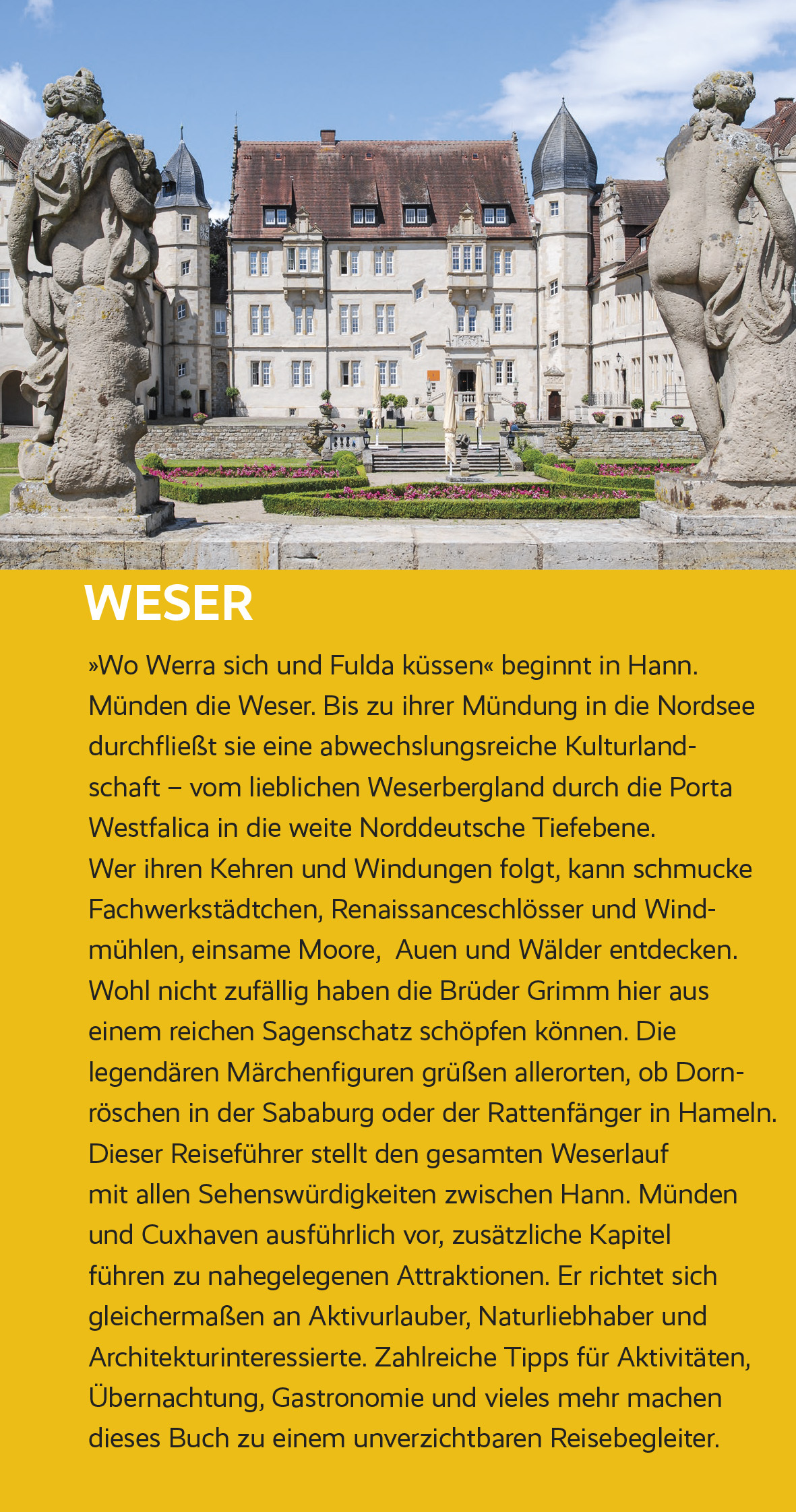 VORWORT»Wo Werra sich und Fulda küssen« - wohl kein anderer Fluss entsteht auf so romantische Art wie die Weser, und in ihrem ganzen Verlauf zeigt sie sich als Strom der Märchen, Sagen und Legenden. Eine Reise flussabwärts beginnt mit einer Visite bei Doktor Eisenbart, führt unter anderem zu Dornröschen, Schneewittchen und Rapunzel, dem tapferen Schneiderlein und einem geheimnisvollen Rattenfänger und endet oft mit einer Berührung der Bremer Stadtmusikanten. Besonders heitere Stunden erleben Gäste, die auf ihrer Erkundungsreise dem Baron Münchhausen und Wilhelm Busch einen Besuch abstatten.Wohl nicht zufällig bevölkern all diese Figuren den Weserraum. Ruhig schlängelt sich die Weser in ihrem Oberlauf dahin, gesäumt von bewaldeten, undurchdringlich scheinenden Hügelketten. Und fast hinter jeder Kurve taucht wie aus dem Nichts ein Schloss, eine Klosterkirche oder eine Burgruine auf, wenden immer wieder kleine Fachwerkorte ihre Schauseite dem Fluss zu, bahnt sich ab und an eine motorlose Fähre geräuschlos ihren Weg ans andere Ufer. Spektakulär ist der Übergang in die Tiefebene am 200 Meter tiefen Durchbruchstal der Porta Westfalica, den das bekannte Kaiser-Wilhelm-Denkmal bekrönt. Nun bestimmen Weite und Großzügigkeit das Bild, Windmühlen und historische Scheunenviertel. Kurze Abstecher können ins Moor führen oder zum größten nordwestdeutschen Binnensee, zu Störchen, Wölfen und Dinosauriern. Hinter Bremen dann ist das Meer zum Greifen nahe, die Ortsbilder künden von der stolzen Vergangenheit der Städte als Überseehäfen, gleichzeitig scheint in den stillen Marschendörfern hinter Deichen und Flussinseln die Zeit langsamer zu vergehen als anderswo.Ihre tiefgreifende äußerliche Prägung erfuhren große Teile des Weserraums vor dem Dreißigjährigen Krieg. Wohlstand und Stolz von Bürgern und Adligen ließen einen eigenwilligen Architekturstil entstehen, der bis heute in Form von Schlössern und Adelshöfen, Handels-, Wohn- und Rathäusern den Charakter der Kulturlandschaft ganz wesentlich mitbestimmt und nur hier anzutreffen ist: die Weserrenaissance. Viele Kleinstädte sehen aus, als hätten sie sich seit Jahrhunderten nicht verändert, und zeigen sich als Renaissancedenkmal wie aus dem Musterbuch. Aber eigentlich wirkt die ganze Landschaft wie ein Freilichtmuseum der Architektur, angefüllt mit märchenhaften Adelssitzen, Klöstern und Wehrkirchen aus dem Spätmittelalter, Kurorten aus der Blütezeit der Grandhotels, Dörfern aus Fachwerk oder Backstein wie im Dornröschenschlaf. Viele Orte entfalten gerade abends ihren besonderen Zauber, wenn sich geschlossene historische Ensembles im Kopfsteinpflaster spiegeln und Besucher sich in frühere Zeiten zurückversetzt fühlen.Die baulichen Schätze reihen sich dicht an dicht, große Teile der Uferlandschaften stehen unter Naturschutz. Die Weser ist ohne Zweifel attraktiv und touristisch hervorragend erschlossen und dennoch zu keiner Jahreszeit überlaufen - fast noch ein Geheimtipp, trotz dreier UNESCO-Welterbestätten. Womöglich aus diesem Grund gab es viele Jahre keinen Reiseführer zur ganzen Weser. Der vorliegende Band möchte diese Lücke füllen und dazu einladen, den schönen ruhigen Fluss vom Weserstein in Hann. Münden bis zum Nationalpark Niedersächsisches Wattenmeer in seiner ganzen Vielschichtigkeit kennenzulernen.>>> Weitere Reiseführer zu interessanten Regionen in Deutschland finden Sie auf der Website des Trescher Verlags.Inhalt