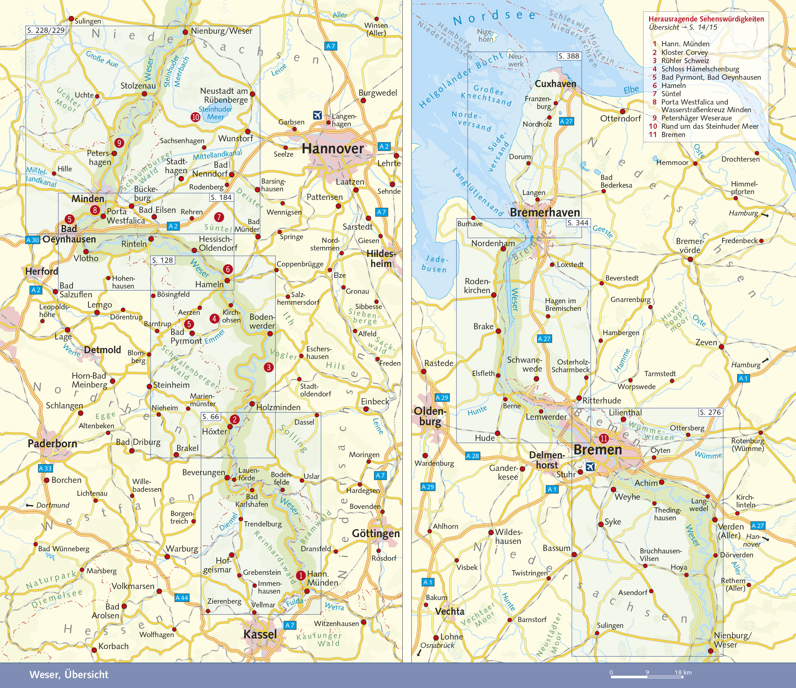INHALTSVERZEICHNIS Vorwort11 Zu diesem Reiseführer12 Entfernungstabelle13 Herausragende Sehenswürdigkeiten14 Das Wichtigste in Kürze16 Unterwegs mit Kindern18 STADT, LAND, FLUSS23 Weser-Steckbrief24 Die Weser Verlauf und Charakter25 Oberweser26 Mittelweser26 Unterweser27 Außenweser27 Nebenflüsse28 Hochwasser und Eisgang28 Wasserqualität29 Naturräume30 Höhenzüge30 Naturparks30 Nationalpark Wattenmeer31 Moore31 Schifffahrt32 Treidler und Flößer32 Raddampfer und Motorschiffe33 Personenschifffahrt34 Weserkorrektion35 Kulturlandschaft Weser37 Schlösser37 Burgen40 Klöster und Kirchen40 Städte und Dörfer41 Wasser- und Windmühlen43 Kurorte44 Gärten und Parks45 Aussichtspunkte und -türme46 Kunst und Kultur49 Literatur49 Weserlied49 Malerei50 Feste und Aufführungen51 Essen und Trinken52 Unterwegs55 Mit Bus und Bahn56 Mit dem Auto56 Mit dem Wohnmobil57 Mit dem Motorrad57 Mit dem Fahrrad57 Zu Fuß60 Mit dem Kanu60 Mit dem Schiff61 Themenstraßen61 Fähren/Übersicht62 OBERWESER65 Von Hann. Münden nach Bodenwerder67 Hann. Münden67 Gemeinde Reinhardshagen74 Hemeln und Umgebung75 Bursfelde77 Gemeinde Wesertal78 Lippoldsberg81 Bodenfelde83 Reinhardswald und Sababurg84 Bad Karlshafen und Umgebung91 Ausflug in den Solling96 Lauenförde und Umgebung102 Beverungen und Umgebung103 Motorradtouren ab Beverungen/Lauenförde109 Fürstenberg112 Höxter114 Corvey119 Motorradtouren ab Höxter125 Holzminden129 Bevern131 Zwischen Holzminden und Bodenwerder136 Bodenwerder und Umgebung147 Zwischen Bodenwerder und Porta Westfalica153 Gemeinde Emmerthal153 Schloss Hämelschenburg160 Abstecher nach Bad Pyrmont163 Abstecher nach Lügde167 Abstecher nach Barntrup169 Abstecher zum Schloss Schwöbber170 Hameln173 Fischbeck185 Hessisch Oldendorf187 Burg Schaumburg190 Rinteln und Umgebung192 Abstecher nach Bückeburg202 Kloster Möllenbeck209 Varenholz210 Vlotho212 Bad Oeynhausen214 Porta Westfalica221 MITTELWESER227 Minden230 Geschichte230 Sehenswürdigkeiten231 Zwischen Minden und Bremen240 Abstecher nach Wiedensahl240 Petershagen242 Petershäger Weseraue244 Stolzenau254 Kloster Schinna255 Abstecher ins Uchter Moor256 Abstecher nach Rehburg-Loccum259 Abstecher zum Steinhuder Meer262 Zwischen Stolzenau und Nienburg267 Nienburg/Weser270 Drakenburg, Eystrup und Umgebung275 Hoya281 Dörverden…