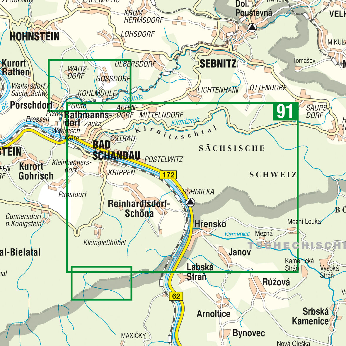 Umfasst das Gebiet der Hinteren Sächsischen Schweiz mit den Orten Bad Schandau, Schmilka, Krippen Reinhardtsdorf-Schöna und Hrensko. Weiterhin sind dargestellt die Schrammsteine, die Affensteine, der Kleine und Große Zschand, der Große Winterberg, der Kleine u...