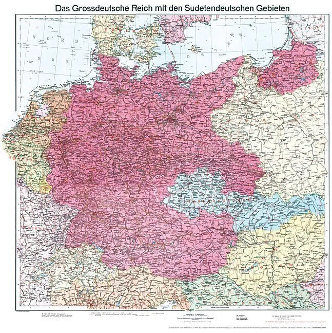 Die Karte 'DAS GROßDEUTSCHE REICH MIT DEN SUDETENDEUTSCHEN GEBIETEN' erschien 1938 im Maßstab 1: 2 000 000. Im vorliegenden Reprint, durch den Verlag Rockstuhl, wurde diese um 8 % verkleinert zum Original. So entsprechen 1 mm auf der Karte nahezu 2 km in Wirkl...