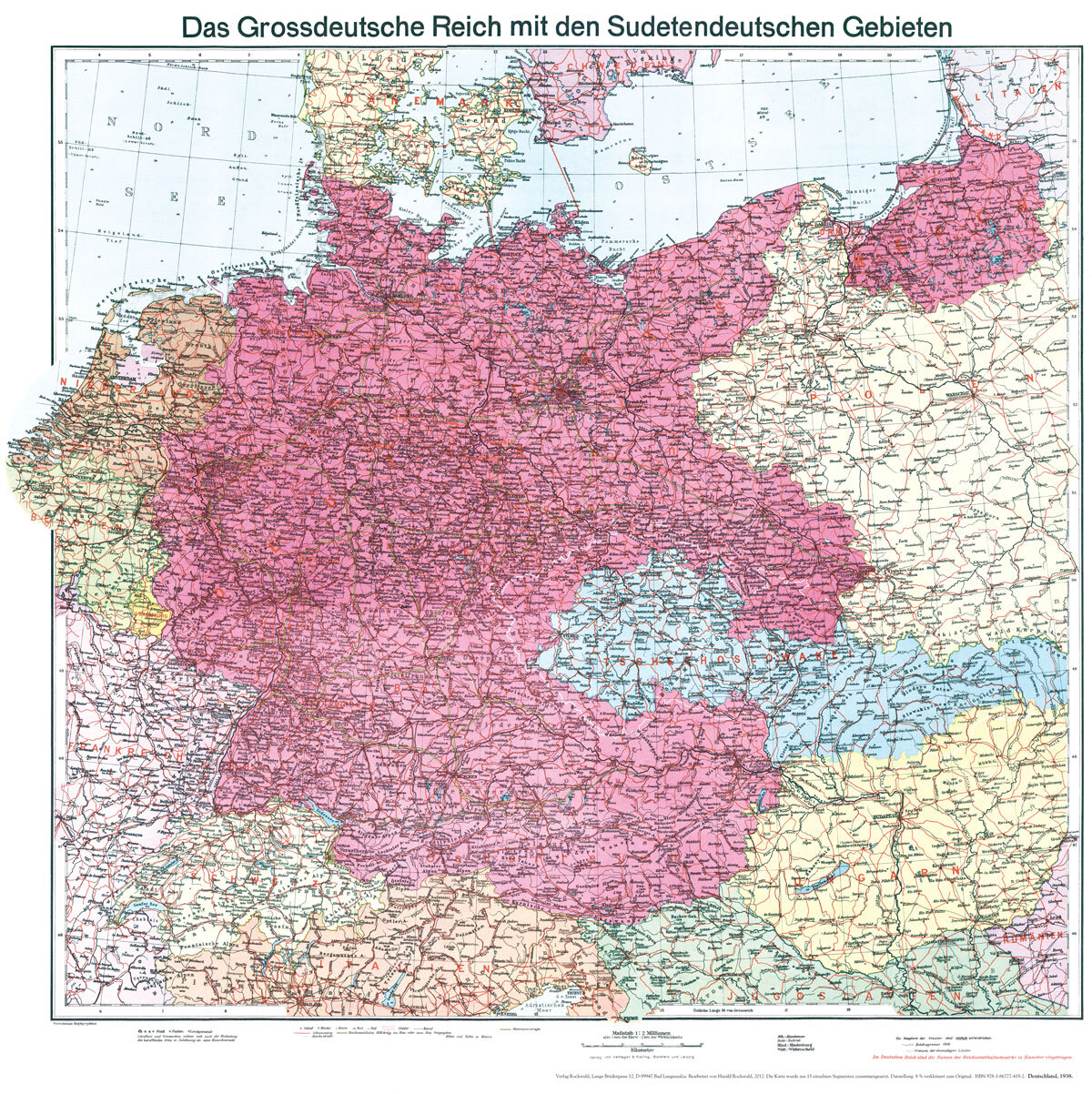 Die Karte 'DAS GROßDEUTSCHE REICH MIT DEN SUDETENDEUTSCHEN GEBIETEN' erschien 1938 im Maßstab 1: 2 000 000. Im vorliegenden Reprint, durch den Verlag Rockstuhl, wurde diese um 8 % verkleinert zum Original. So entsprechen 1 mm auf der Karte nahezu 2 km in Wirkl...
