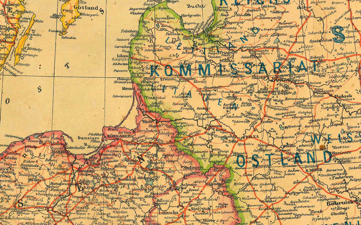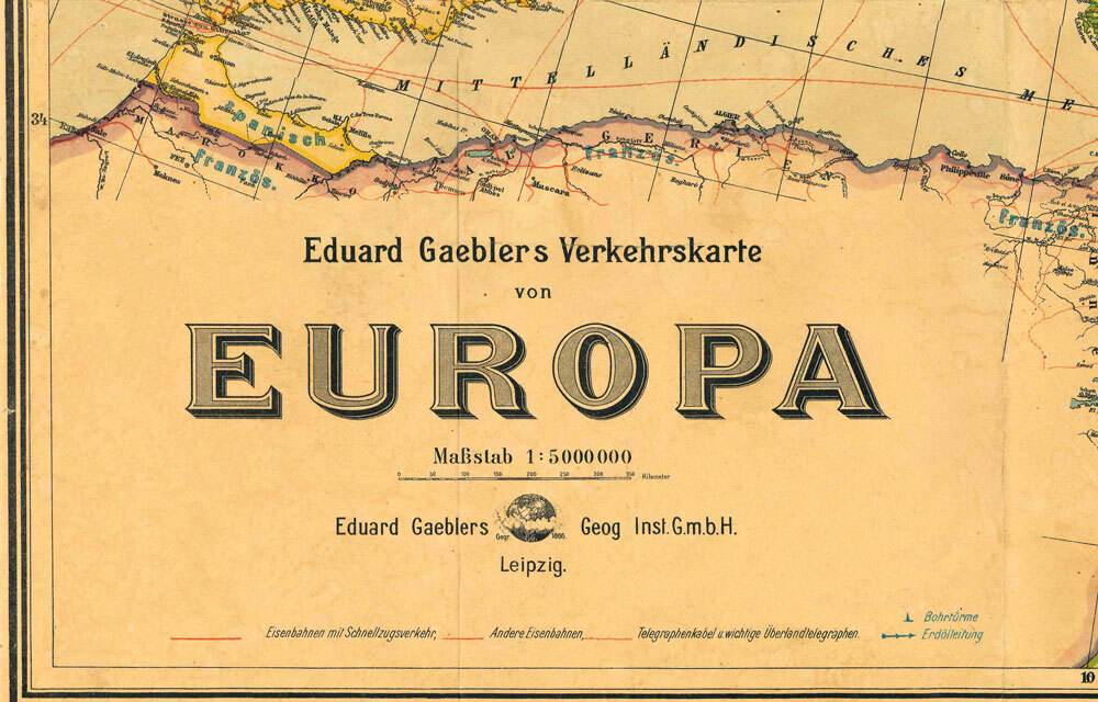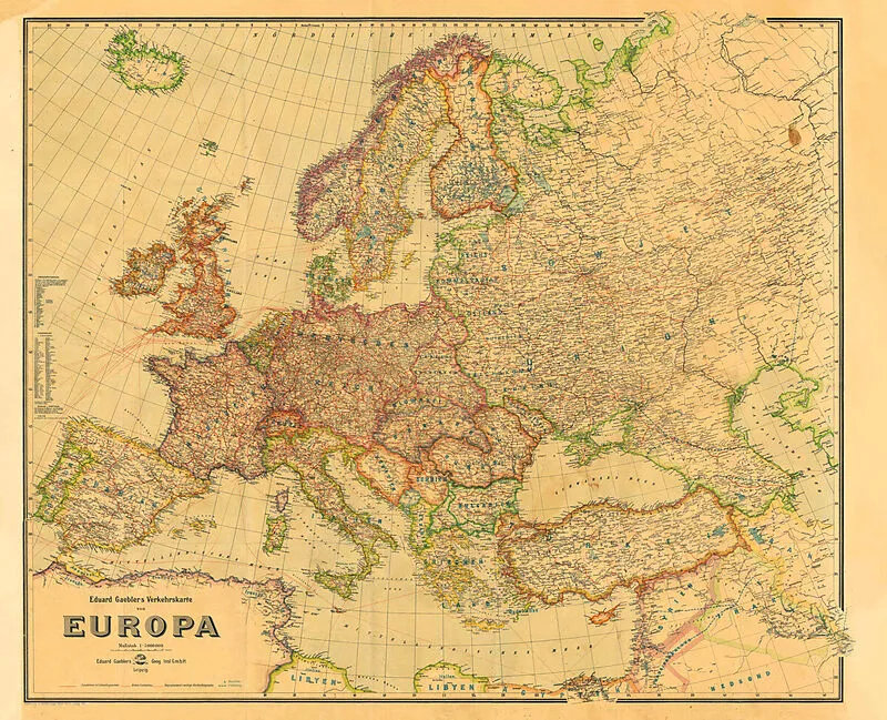 Nachdruck, Format (Breite x Höhe) 84 x 70 cm. Grenz-und flächenkolorierte Karte. Eduard Gaeblers Verkehrskarte. Maßstab 1: 5 000 000. Darstellung 27 % verkleinert zum Original. Zeigt Europa vor dem Angriff Deutschlands auf die Sowjetunion. [Lieferung in einer ...