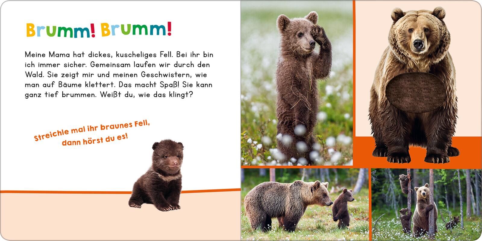 Hörst du die Löwenmama? Die Löwenmama brüllt ganz laut und beschützt ihre beiden kleinen Babys. Und was für Geräusche machen das Känguru, der Bär, der Elefant und die Ente? Hier kannst du sie entdecken. Einfach über das kuschelweiche Fell der Tiermamas streic...