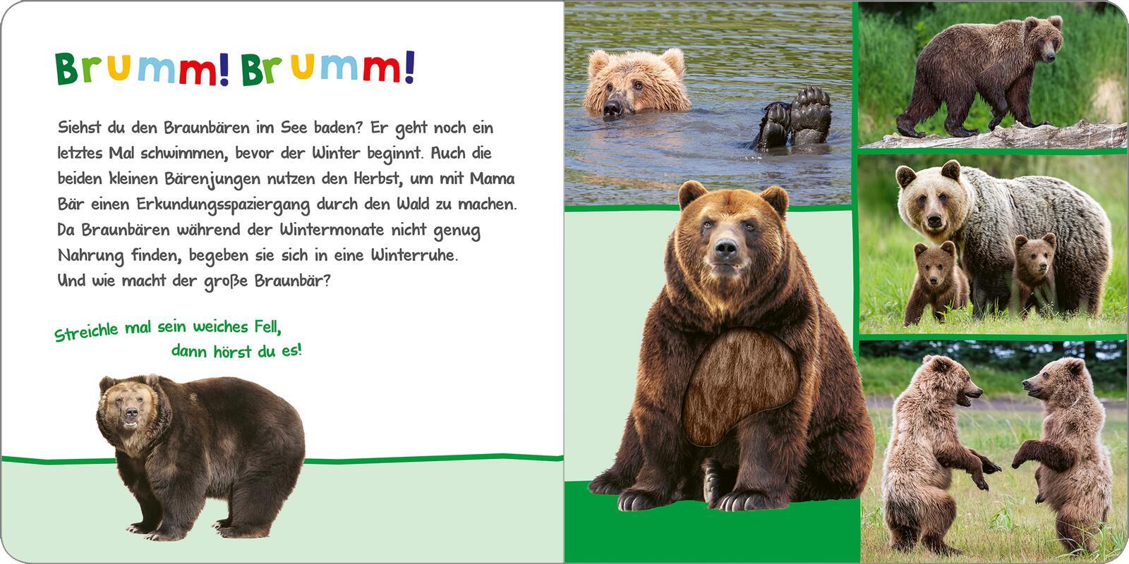 **Der Braunbär brummt, das Eichhörnchen keckert und der Igel schmatzt. Doch wie klingen der Siebenschläfer und der Storch? Hier kannst du es entdecken. Einfach über das kuschelweiche Fell der Tiere streicheln und schon wird der Herbstwald lebendig. Das Fühlbuch mit vielen hochwertigen Fotos und Soundmodulen begeistert schon die Kleinsten und macht das gemeinsame Vorlesen zum interaktiven Erlebnis für alle Sinne.