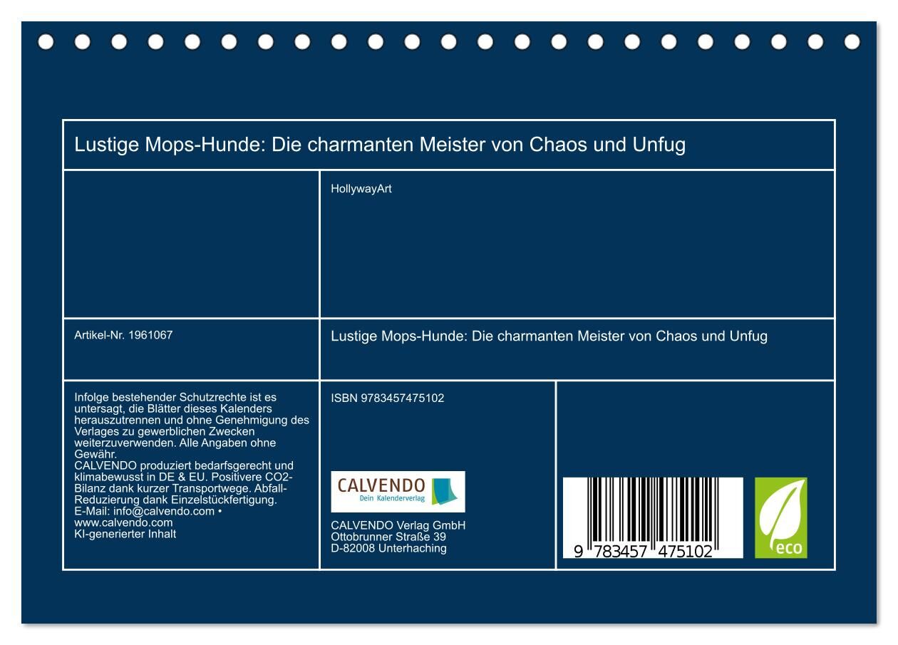 Der Kalender "Lustige Mops-Hunde: Die charmanten Meister von Chaos und Unfug" präsentiert zwölf entzückende, humorvolle Porträts von Mopshunden in alltäglichen, doch außergewöhnlichen Situationen. Jeder Monat offenbart einen neuen, charmanten Mops, der mit sei...