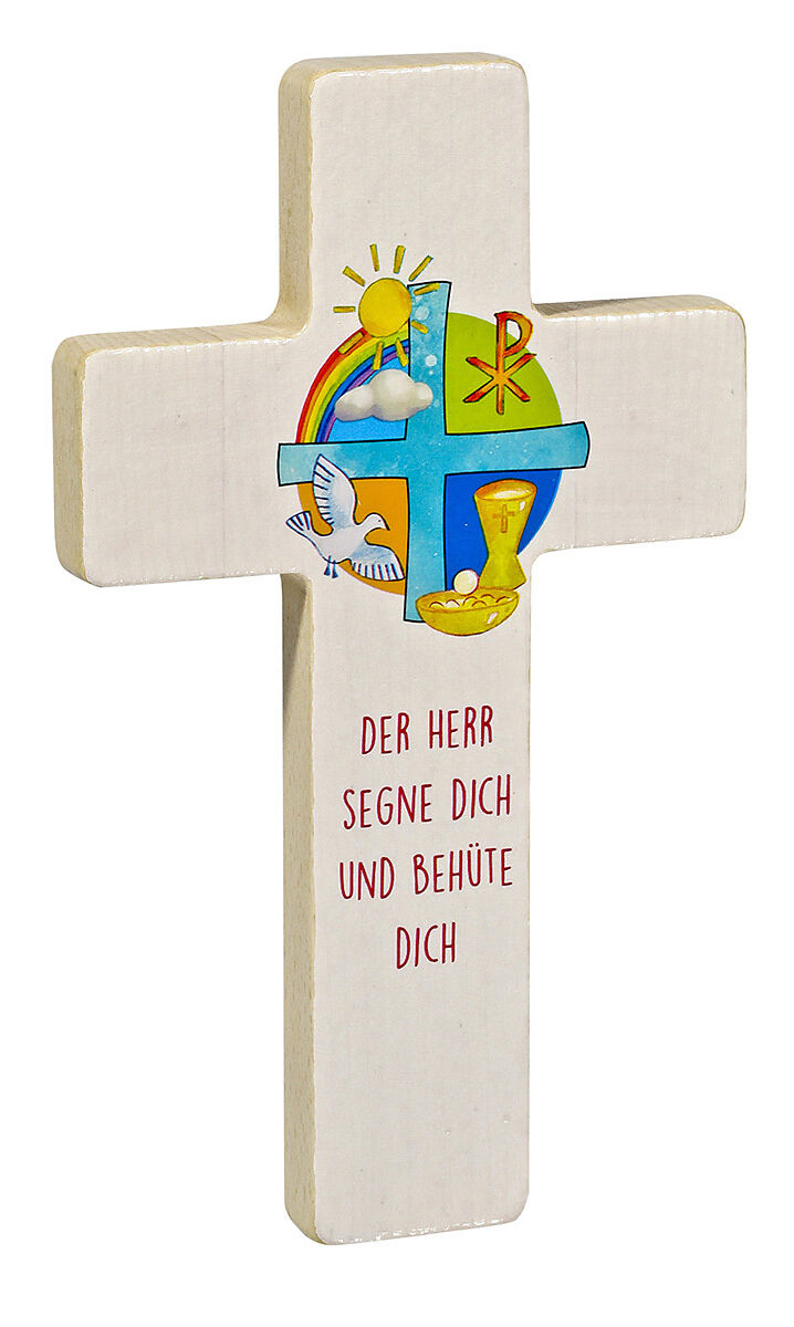 Für junge Christen ist die Erstkommunion ein großer Schritt innerhalb ihrer Gemeinde. Bringen Sie zu diesem bedeutenden Anlass Kinderaugen mit diesem liebevoll gestalteten Holzkreuz zum Strahlen. Das farbenfrohe Motiv greift wesentliche Elemente des christlich...